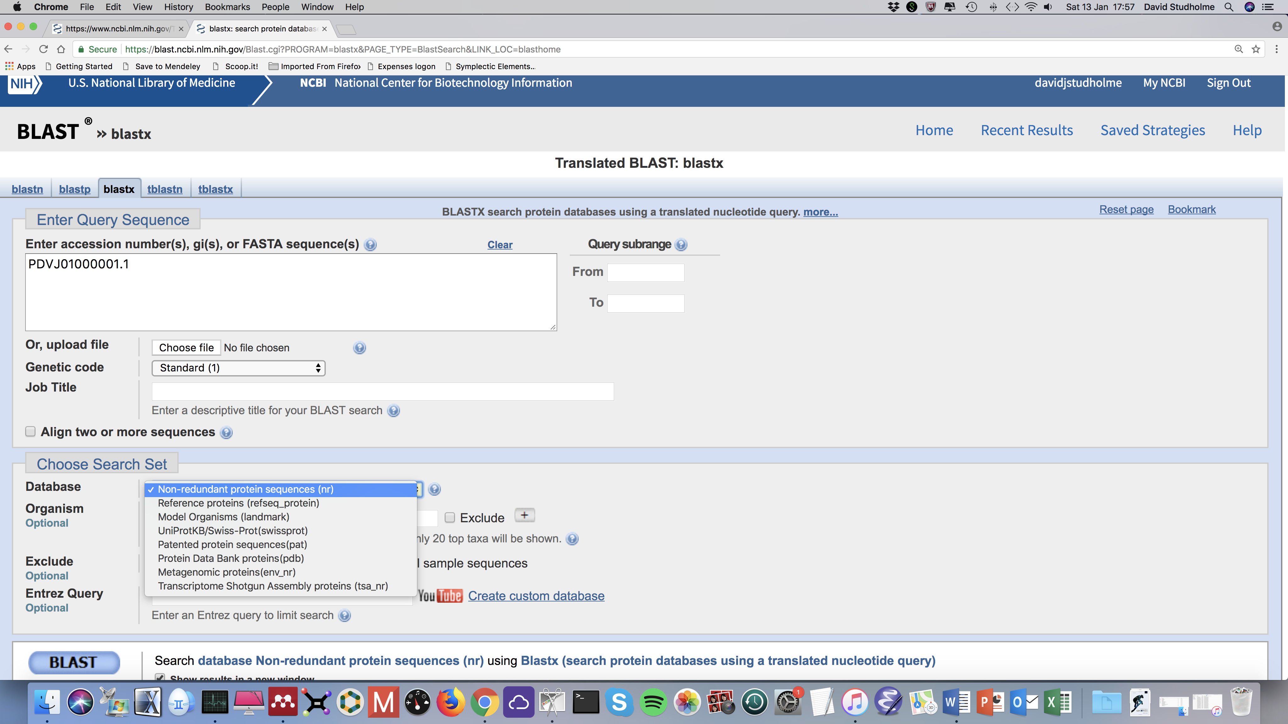 Remember, there are several ‘flavours’ of BLAST (BLASTN, BLASTP, TBLASTN, BLASTX, TBLASTX); which one should you use and why? (Clue: BLASTX takes a DNA query sequence and searches against a database of proteins). You can perform your BLAST search at https://blast.ncbi.nlm.nih.gov/Blast.cgi as in the example in the image below.