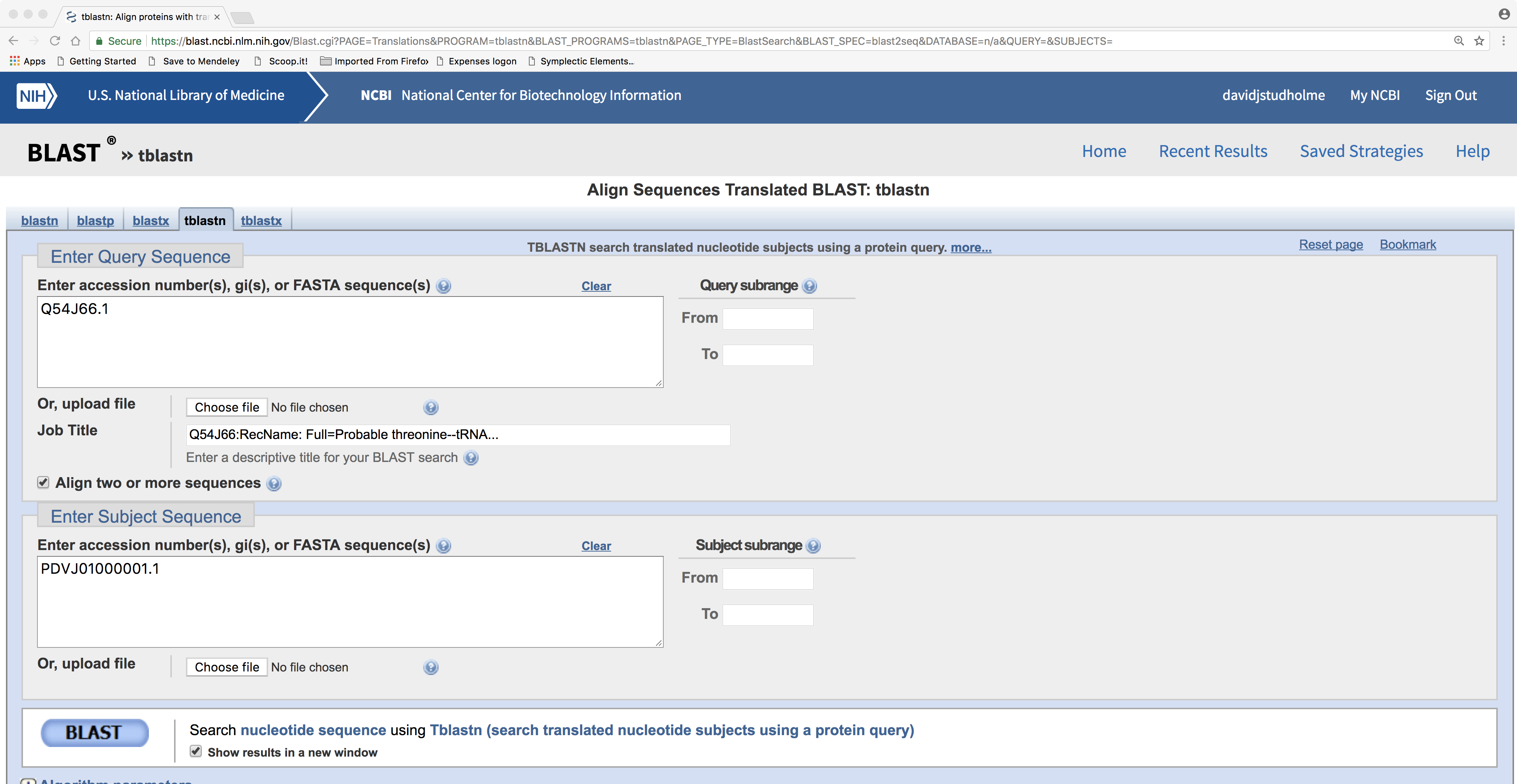 In the example above, we can see that protein accession P07323.2 is homologous with our newly discovered gene. So, let’s use TBLASTN to get the sequence of our new gene by aligning the protein against the DNA sequence. This time we will use the “Align two or more sequences” option and we will use previously described protein P07323.2 as the query and metagenomic DNA sequence accession PDVJ01000001.1 as the ‘subject sequence’ against which we will search the query: