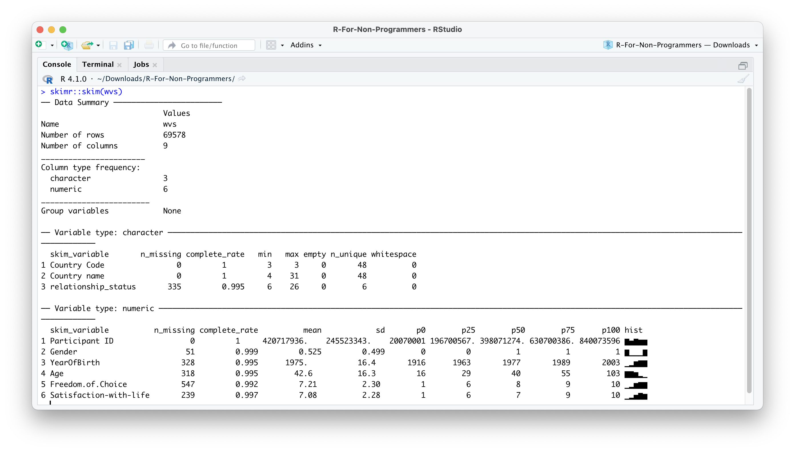 For the rest of this chapter, we will use the wvs dataset from the r4np package. However, we do not know much about this dataset, and therefore we cannot ask any research questions worth investigating. Therefore, we need to look at what it contains. The first method of inspecting a dataset is to type the name of the object, i.e. wvs.