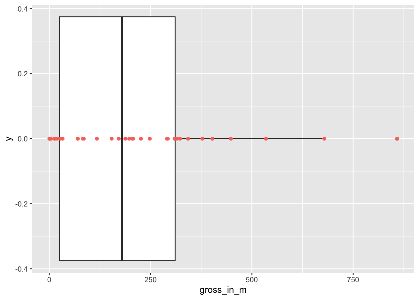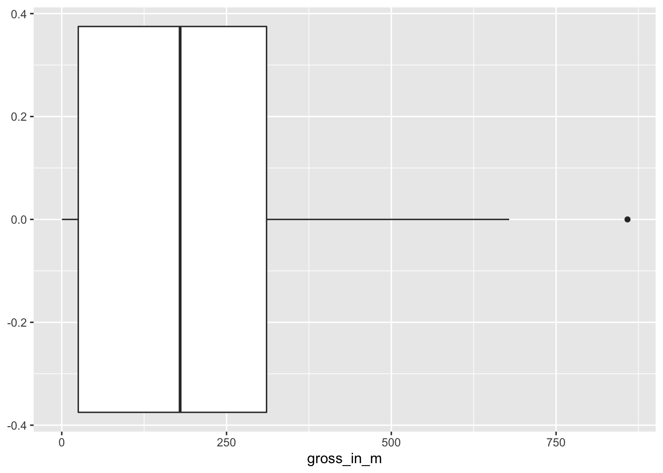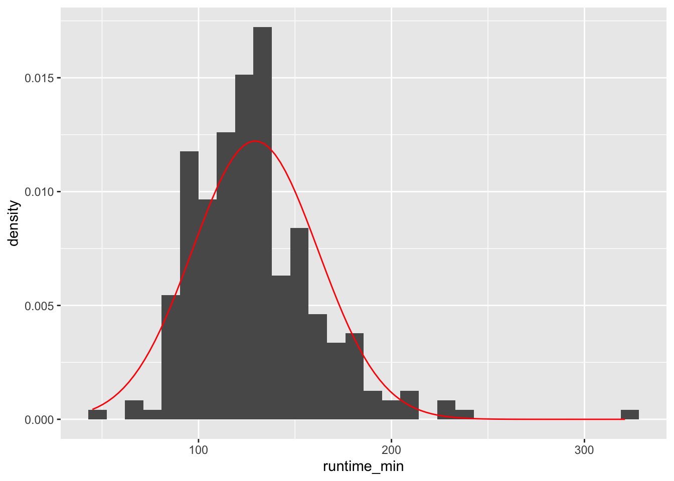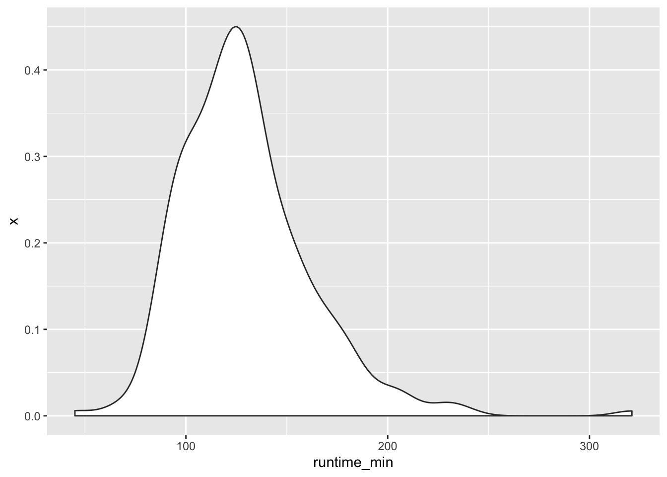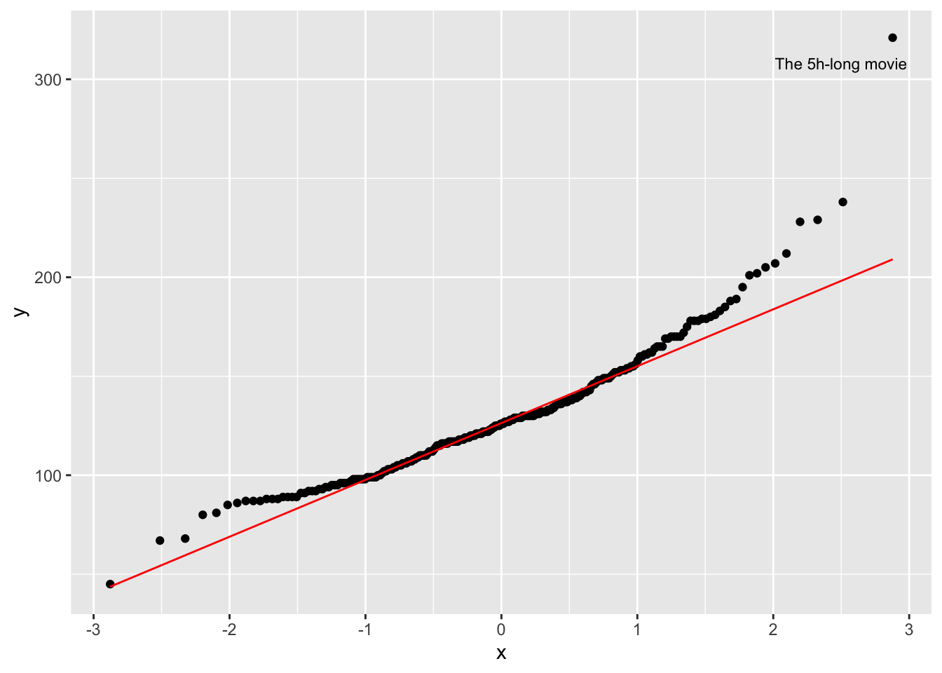 The function geom_qq() creates the dots, while geom_qq_line establishes a reference for a normal distribution. The reference line is drawn in such a way that it touches the quartiles of our distribution. Ideally, we would want that all dotes are firmly aligned with each other. Unfortunately, this is not the case in our dataset. At the top and the bottom, we have points that deviate quite far from a normal distribution. Remember the five-hour-long movie? It is very far away from the rest of the other movies in our dataset.