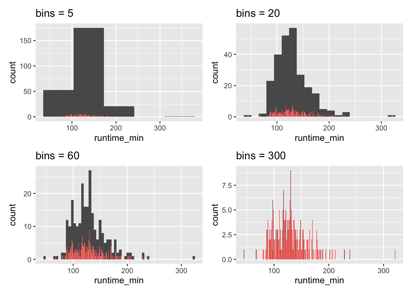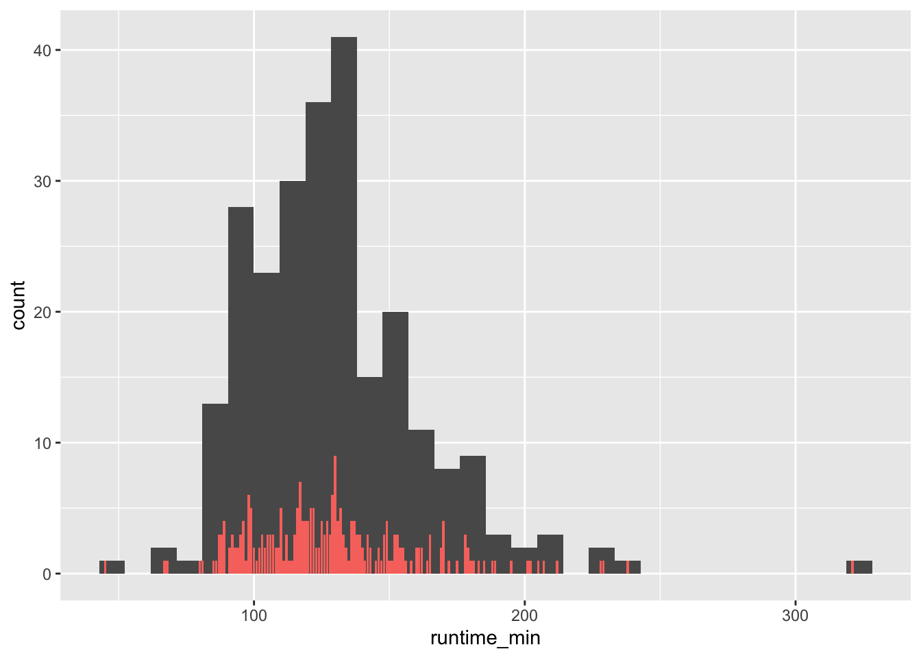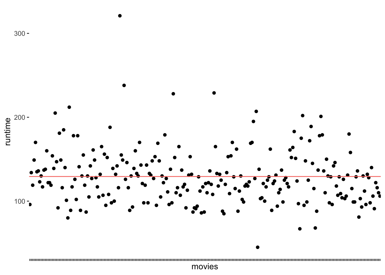 The red line (created with geom_hline() represents the mean runtime for all movies in the dataset, which is 129 minutes. We notice that the points are falling above and below the mean, but not directly on it. In other words, there are not many movies that are about 129 minutes long. We make this visualisation even more meaningful if we sorted the movies by their runtime. We can also change the shape of the dots (see also Chapter 10) by using the attribute shape. This helps to plot many dots without having them overlap.