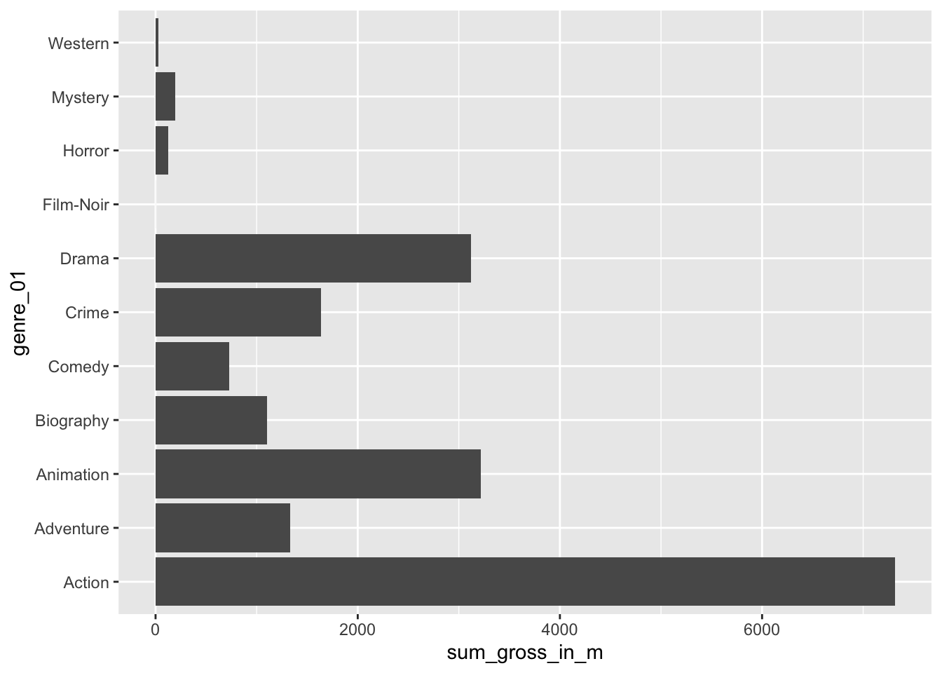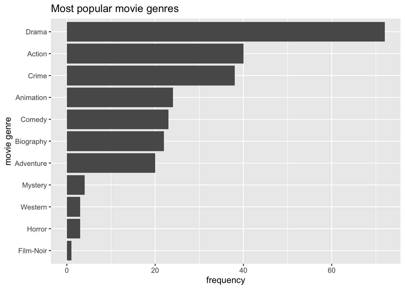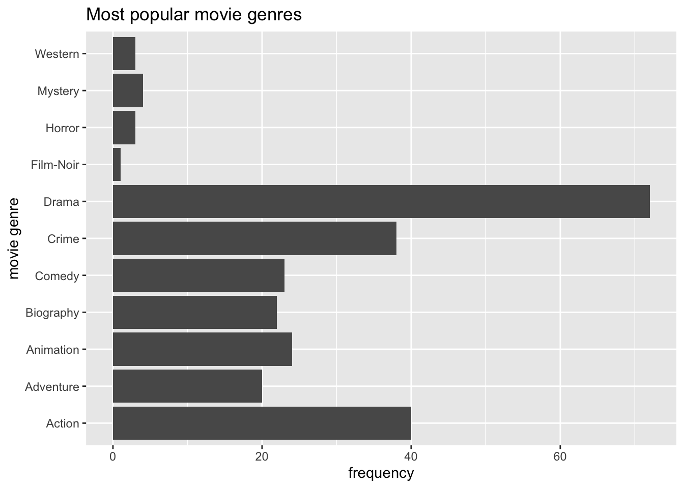 When working with factors, the category names can be rather long. In this plot, we have lots of categories, and the labels Adventure, Animation, and Biography are a bit too close to each other for my taste. This might be an excellent opportunity to use coord_flip(), which rotates the entire plot by 90 degrees, i.e. turning the x-axis into the y-axis and vice versa. This makes the labels much easier to read.