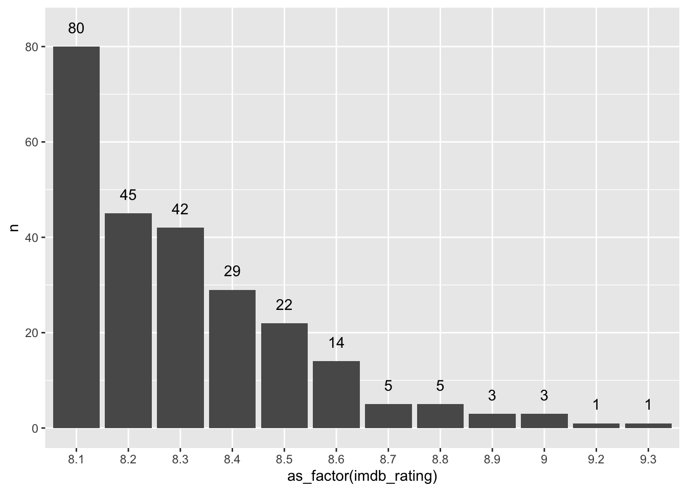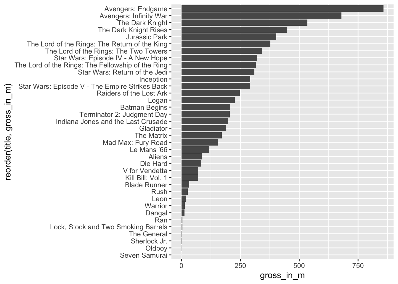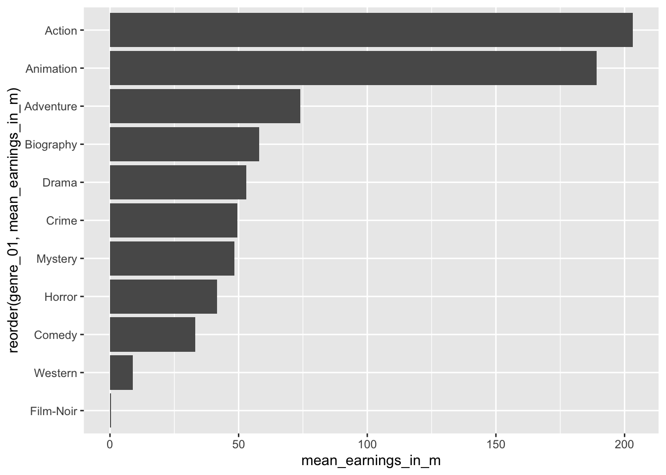 When working with factors, the category names can be rather long. In this plot, we have lots of categories, and the labels Adventure, Animation, and Biography are a bit too close to each other for my taste. This might be an excellent opportunity to use coord_flip(), which rotates the entire plot by 90 degrees, i.e. turning the x-axis into the y-axis and vice versa. This makes the labels much easier to read.
