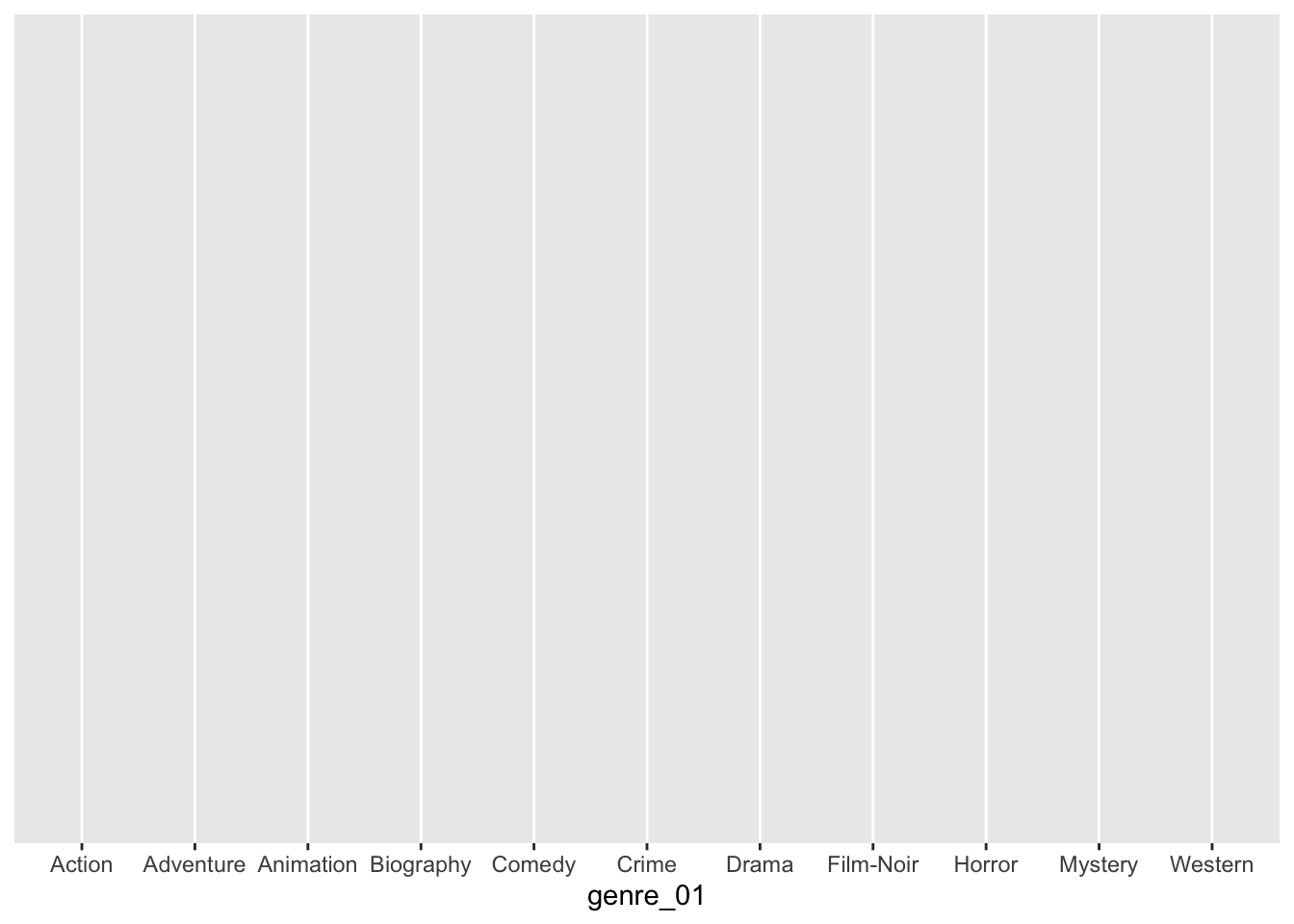 Running this line of code will produce an empty plot. We only get labels for our x-axis since we defined it already. However, we have yet to tell ggplot() how we want to represent the data on this canvas. Your choice for how you want to plot your data is usually informed by the type of data you use and the statistics you want to represent. For example, plotting the mean of a factor is not meaningful, e.g. computing the mean of movie genres. On the other hand, we can count how often specific genres appear in our dataset. One way of representing a factor’s count (or frequency) is to use a bar plot. To add an element to ggplot(), i.e. bars, we use + and append the function geom_bar(), which draws bars. The + operator works similar to %>% and allows to chain multiple functions one after the other as part of a ggplot().
