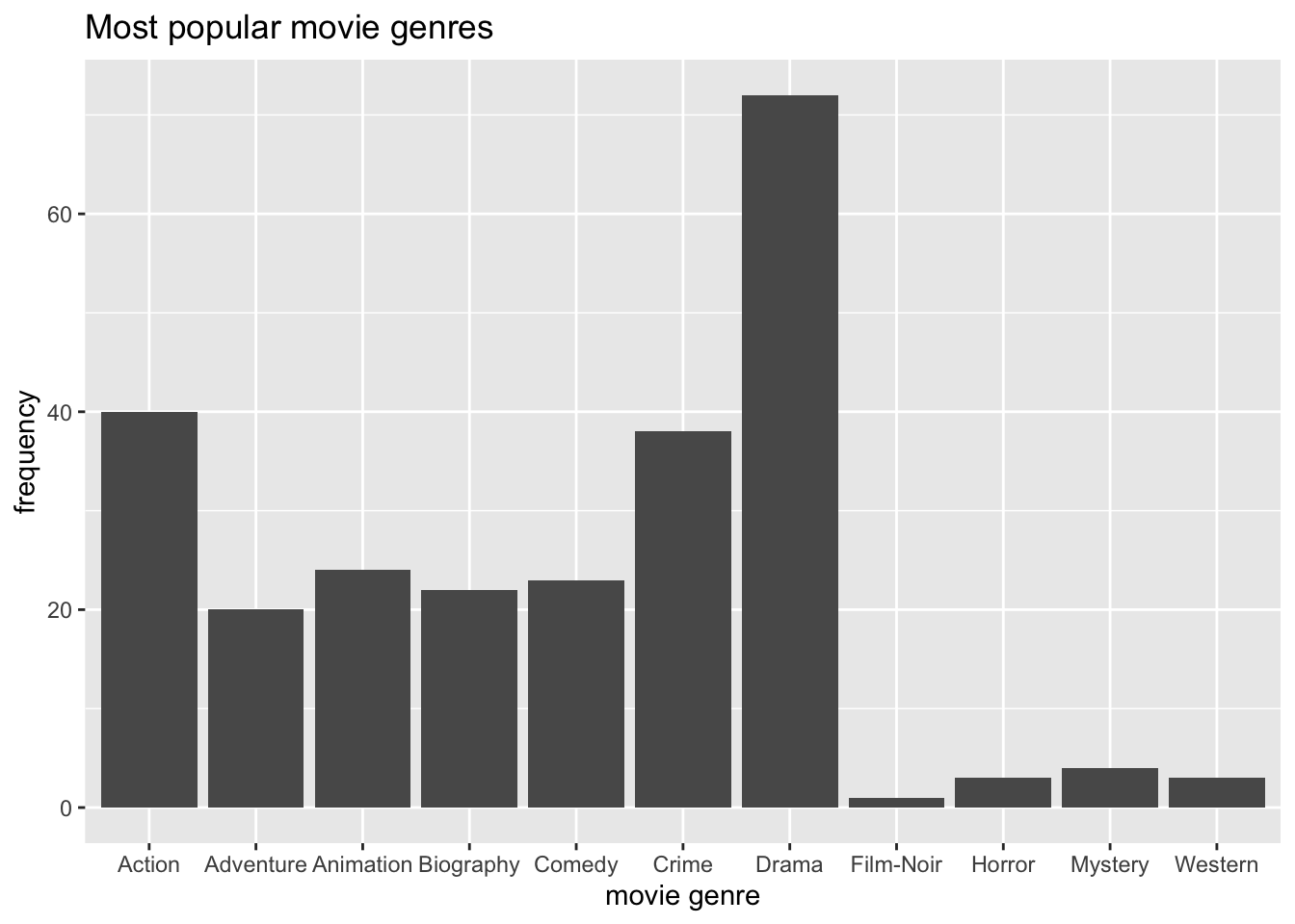 With only two lines of coding, we created a great looking plot. We can see that Drama is by far the most popular genre, followed by Action and Crime. Thus, we successfully found an answer to our question. Still, there are more improvements necessary to use it in a publication.