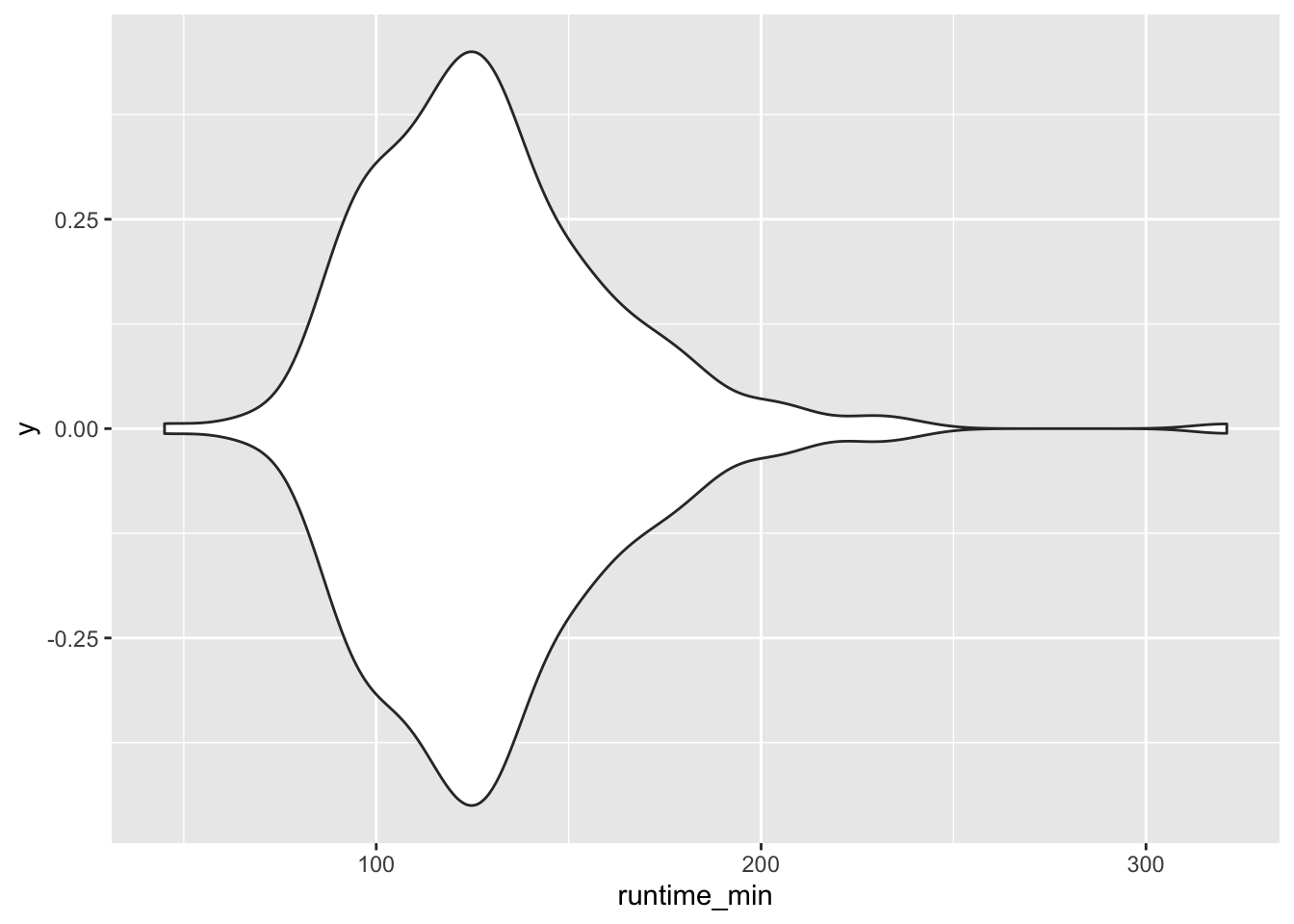 If a density plot is the sibling of a histogram, the violin plot would be the sibling of a boxplot, but the twin of a density plot. Confused? If so, then let’s use the function geom_volin() to create one.