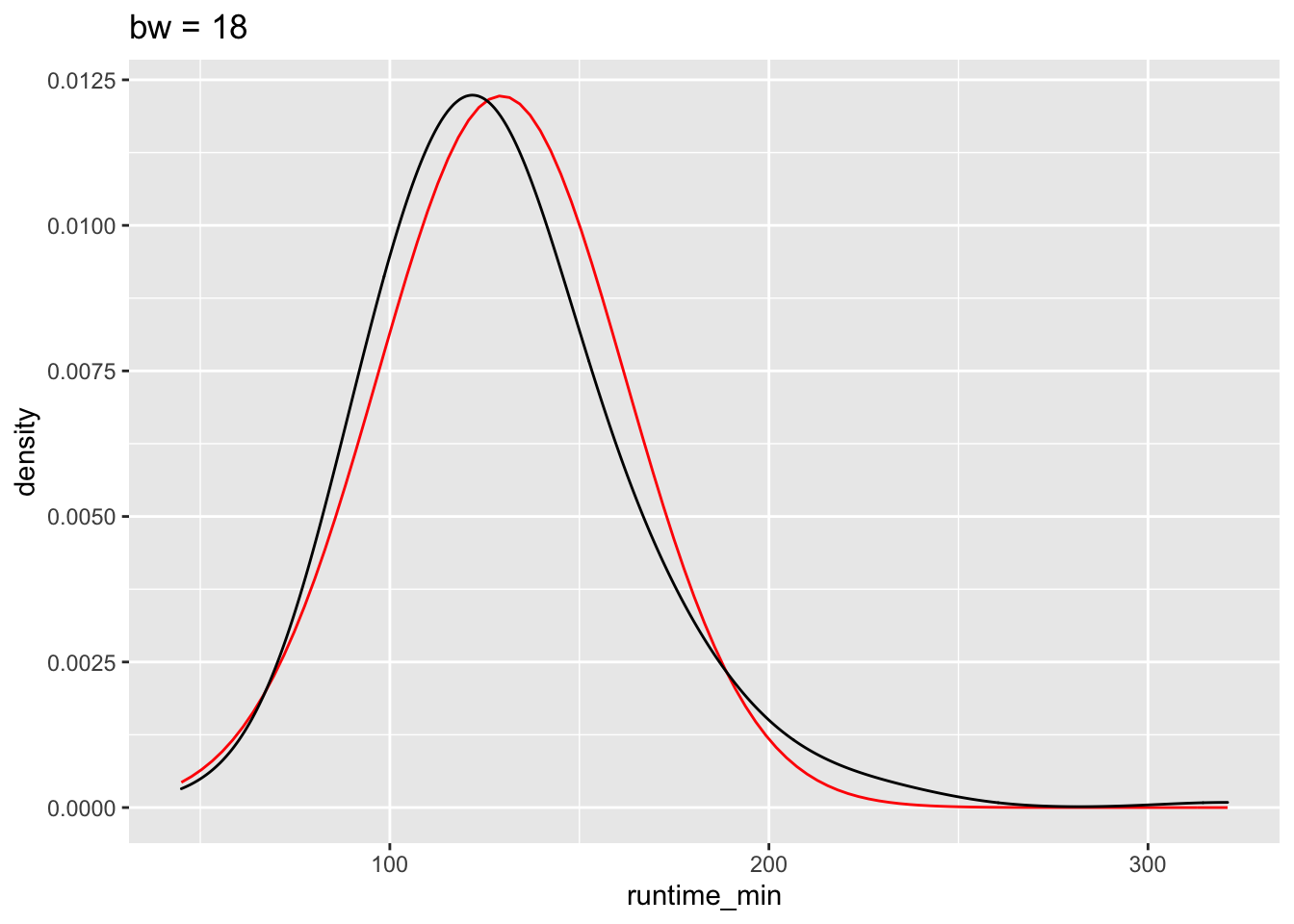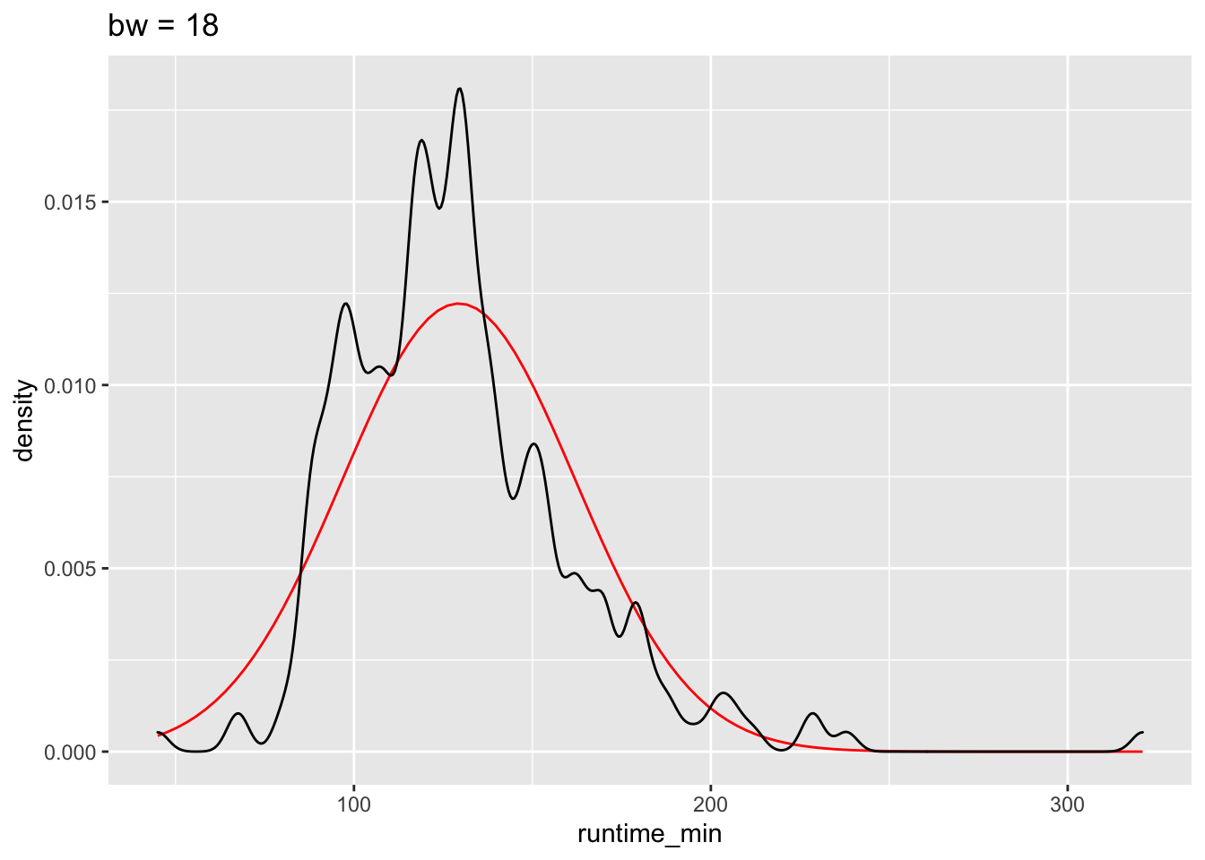 The benefits of the density plot in this situation are obvious: It is much easier to see whether our data is normally distributed or not when compared to a reference plot. However, we still might struggle to determine normality just by these plots because it depends on how high or low we set bw.