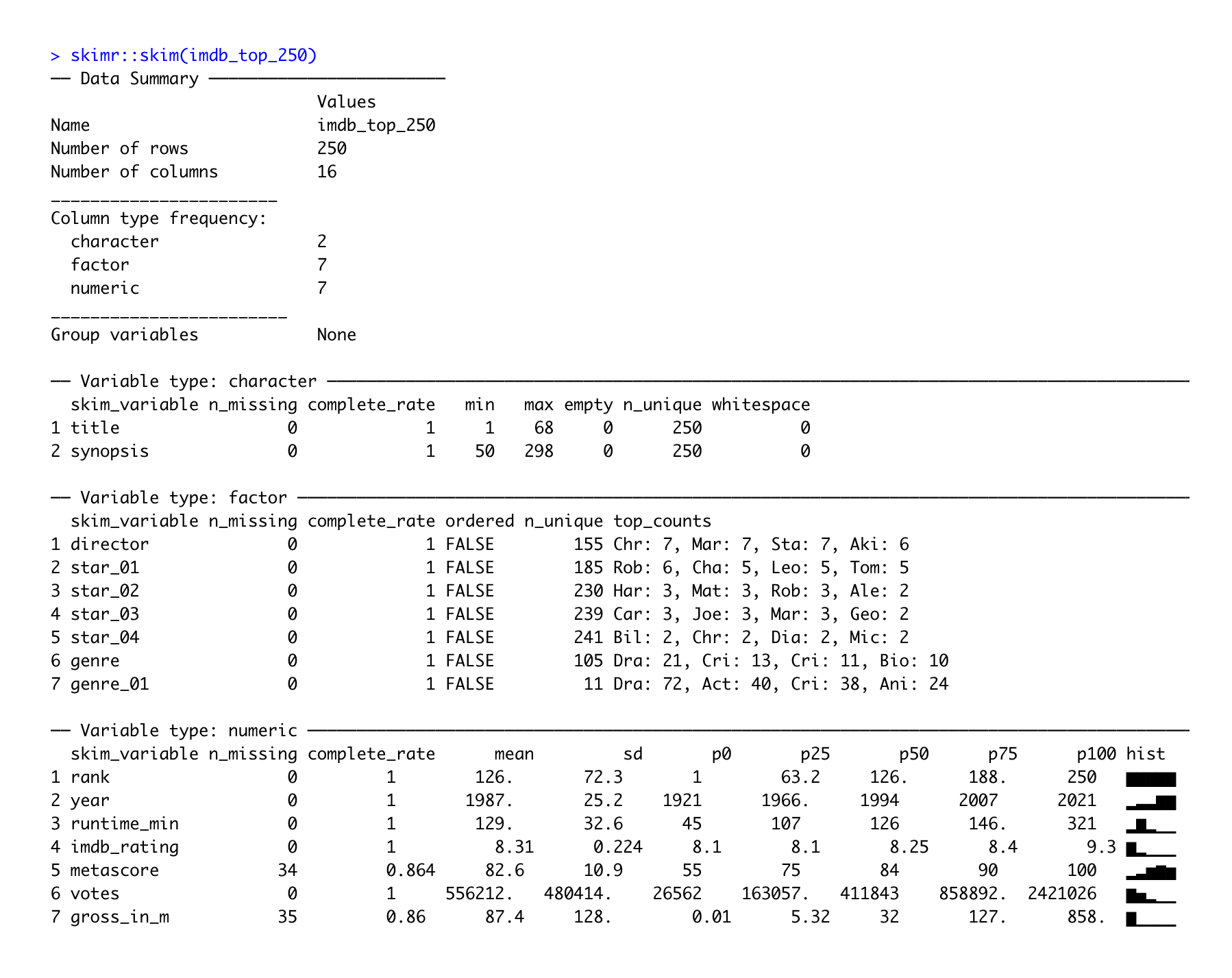 In addition to providing descriptive statistics, skim() sorts the variables by data type and provides different descriptive statistics meaningful to each kind. Apart from that, the column n_missing can help spot missing data. Lastly, we also find a histogram in the last column for numeric data, which I find particularly useful.