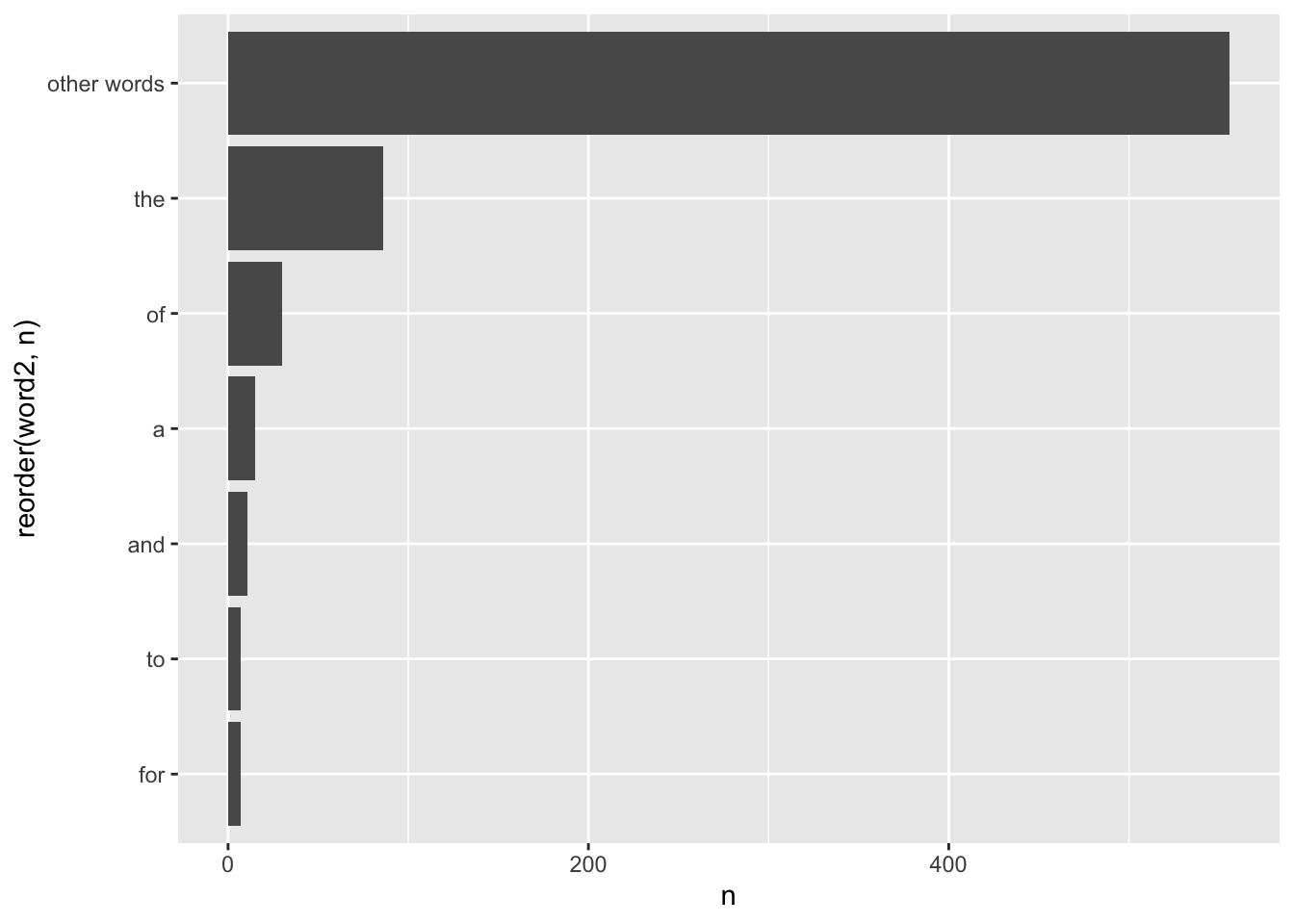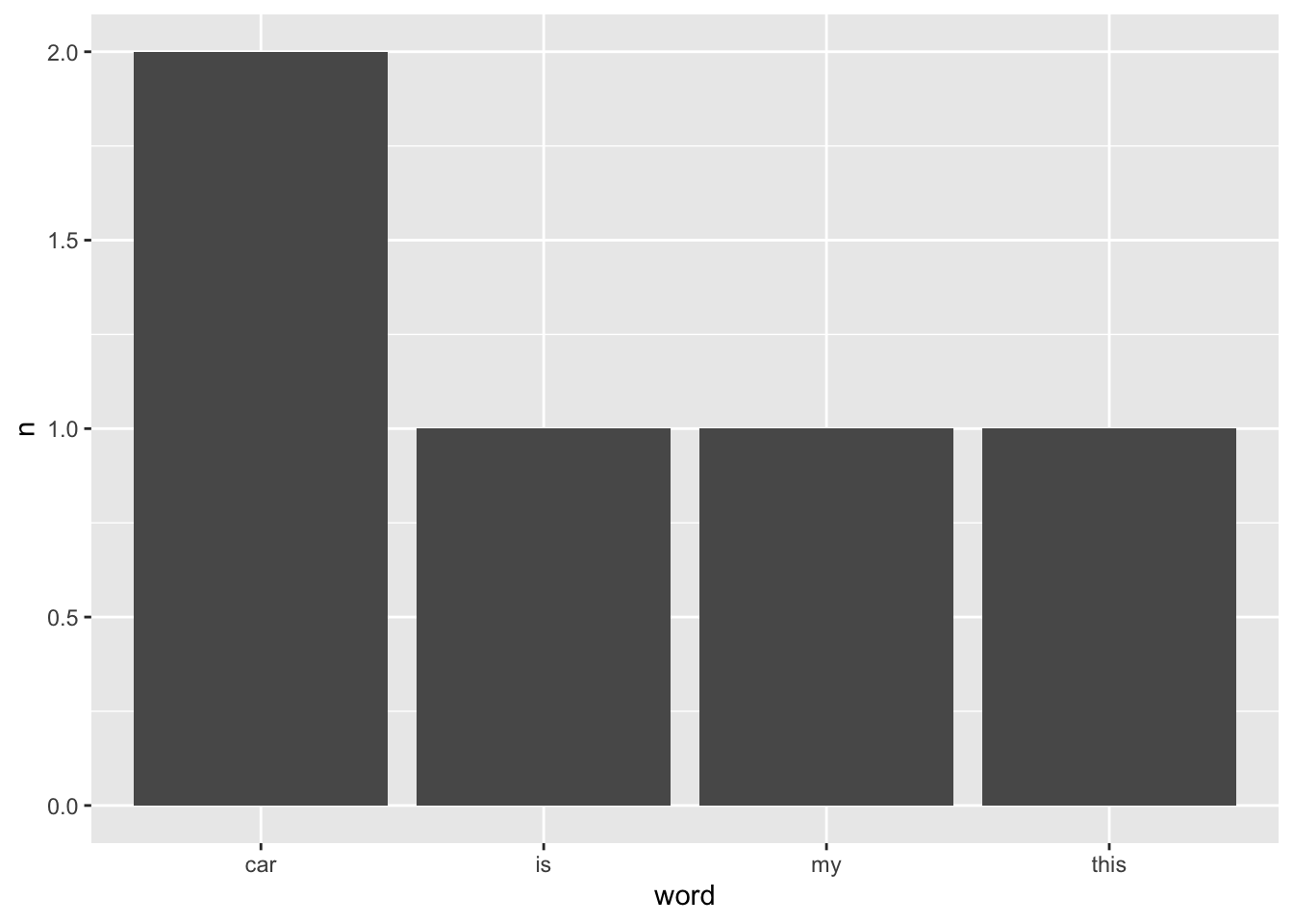 #> 4 this 1Since we have our data nicely summarised, we can also easily visualise it using ggplot().