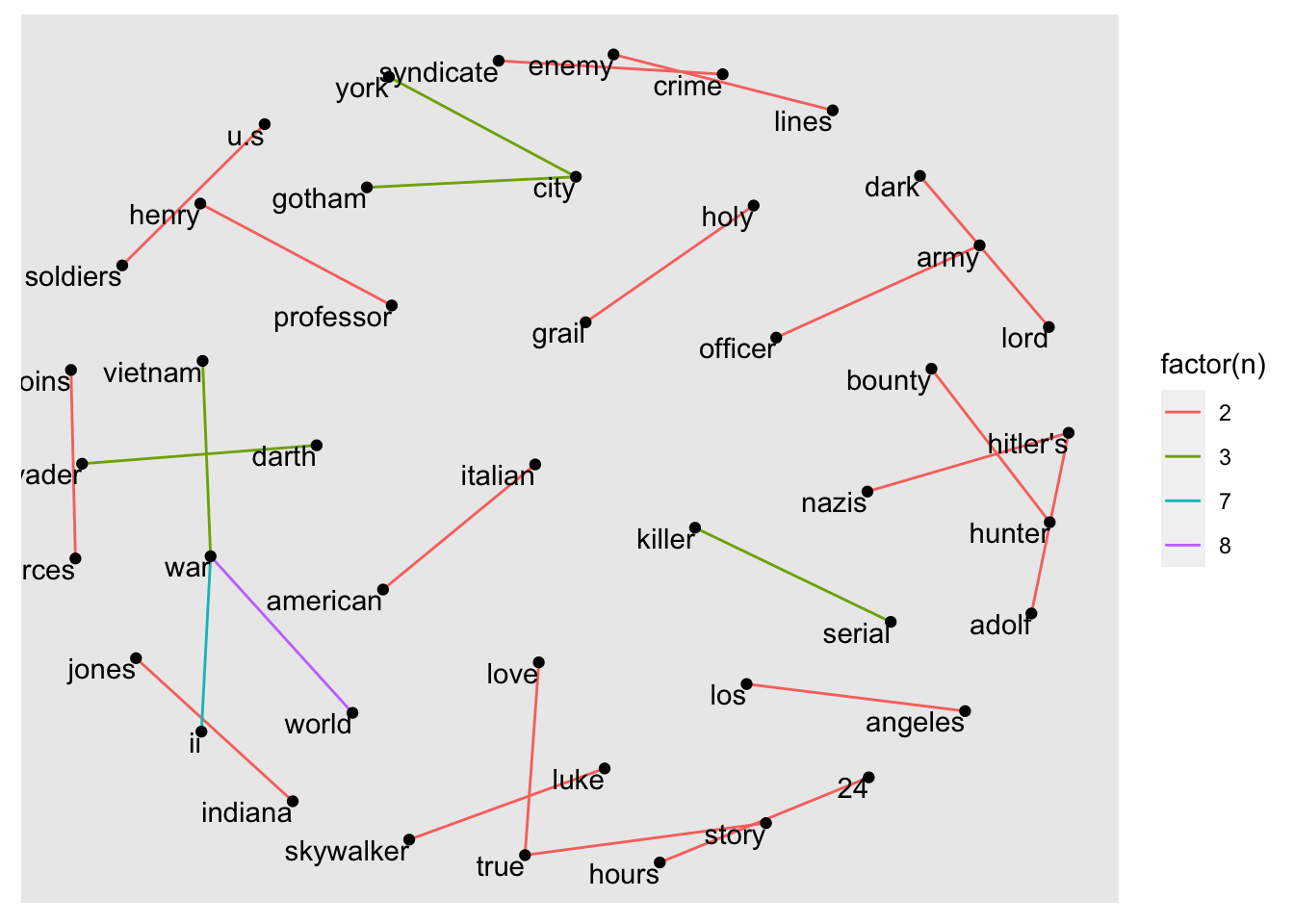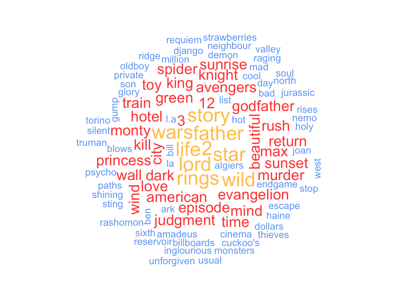 The final plot shows that war and other military aspects, e.g. soldiers, army are very prevalent in our dataset. Besides, we also find some famous movie characters in our visualisation, such as darth vader, luke skywalker or indiana jones.