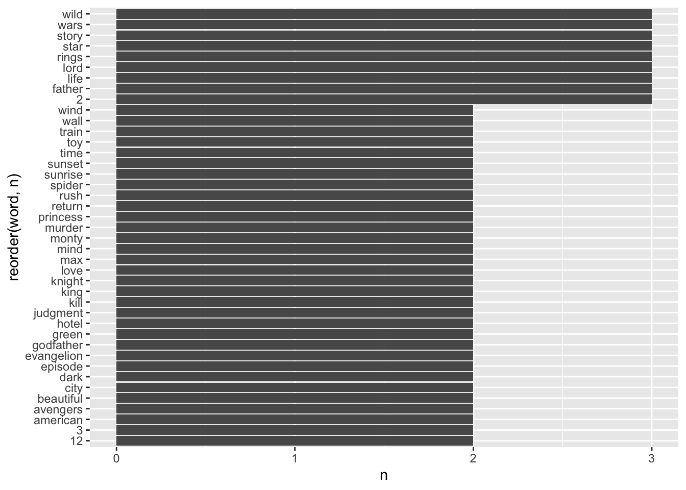#> # … with 702 more rowsOur new data frame has considerably more rows, i.e. 712, which hints at around 3 words per title on average. If you are the curious type, like me, we already can peek at the frequency of words in our dataset.