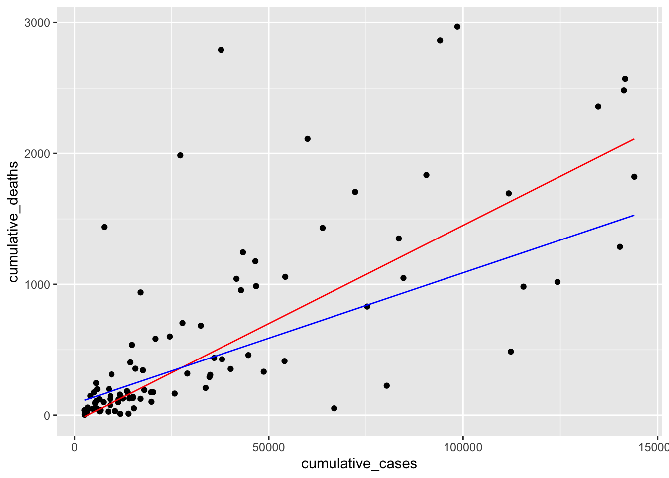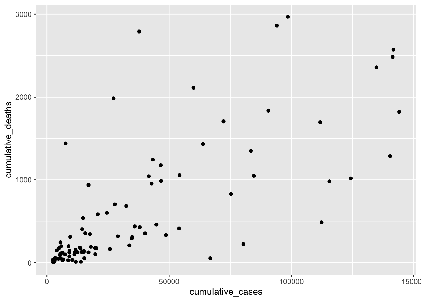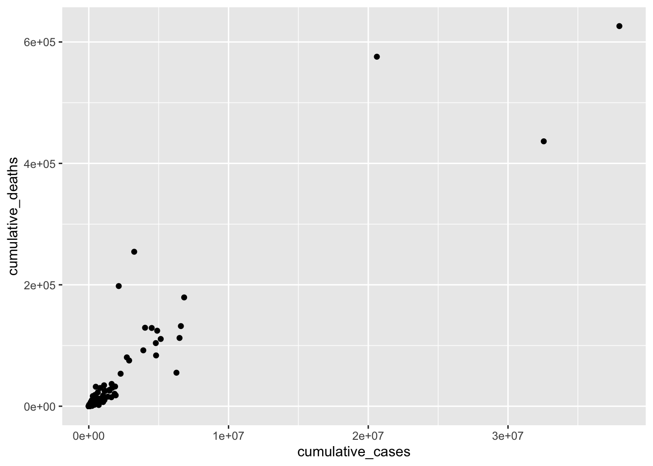As a result, the scatterplot is now easier to read, and the dots are more spread out. This reveals that there is quite a strong relationship between cumulative_cases and cumulative_deaths. However, similar to before, we should avoid outliers when performing our analysis. For the sake of simplicity, I will limit the number of countries included in our analysis, which also removes the requirement of using scale_x_continuous() and scale_y_continuous().