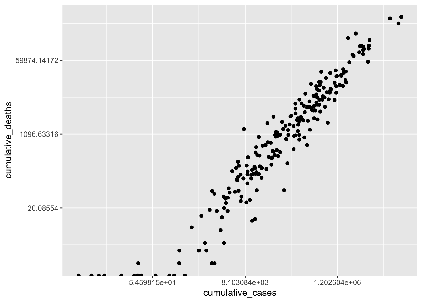 This data visualisation does not show us much. For example, we can see three countries, which appear to have considerably more cases than most other countries. Thus, all other countries are crammed together in the bottom left corner. To improve this visualisation without removing the outliers, we can rescale the x- and y-axis using the function scale_x_continuous() and scale_y_continuous() and apply a "log" transformation.