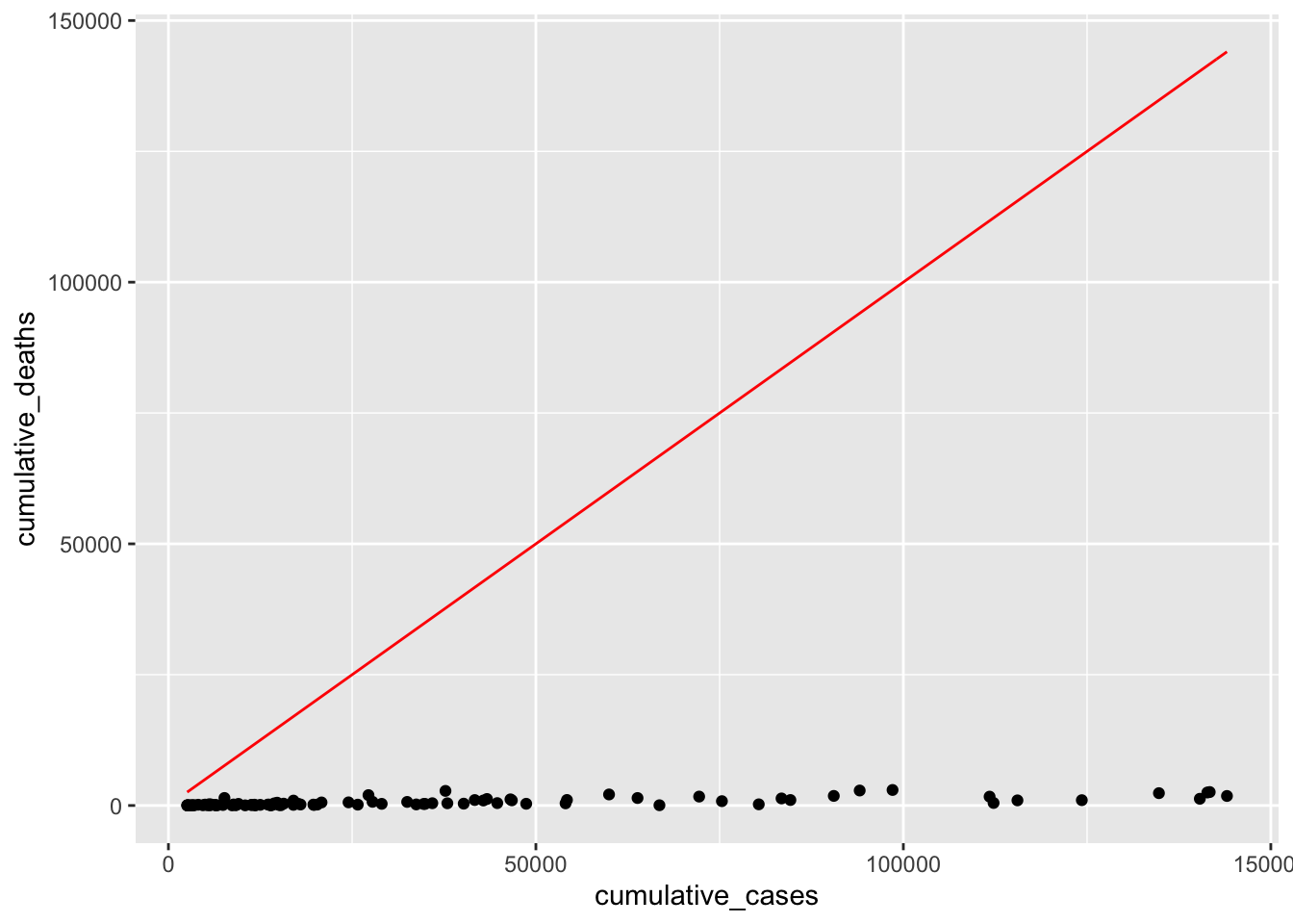 What we try to achieve is that the red line fits nicely inside the cloud of dots. Our simple model provides a very poor fit to our data points, because the dots are considerably below it. This makes sense because \(y = x\) would imply that every COVID-19 case leads to a death, i.e. everyone with COVID did not survive. From our own experience, we know that this is luckily not true. Ideally, we want the line to be less steep. We can do this by adding a \(\beta_1\) to our equation. Maybe only 2% of people who got COVID-19 might not have recovered, i.e. \(\beta_1 = 0.02\).
