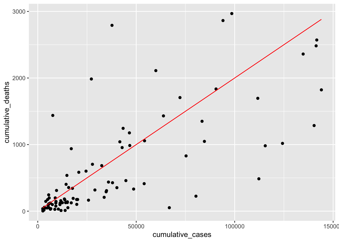If everything so far sounds all awfully theoretical, let’s try to fit a regression model by hand. First, we need to consider what our model should be able to predict. Let’s say that the number of COVID-19 cases predicts the number of deaths due to COVID-19. Intuitively we would assume this should be a linear relationship because the more cases there are, the more likely we find more deaths caused by it.