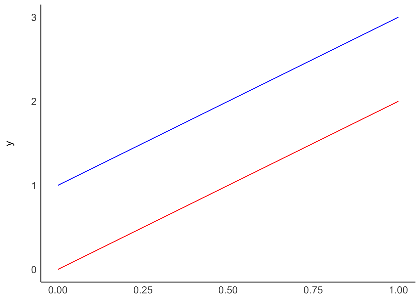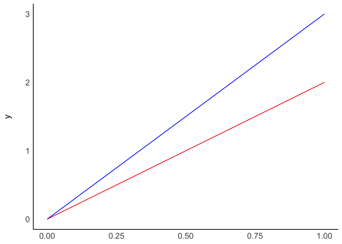 Plot A shows two regressions where only \(\beta_0\) differs, i.e. the intercept. On the other hand, plot B shows what happens if we change \(\beta_1\), i.e. the slope. The two models in plot B have the same intercept and, therefore, the same origin. However, the blue line ascends quicker than the red one because its \(\beta_1\) is higher than for the red model.