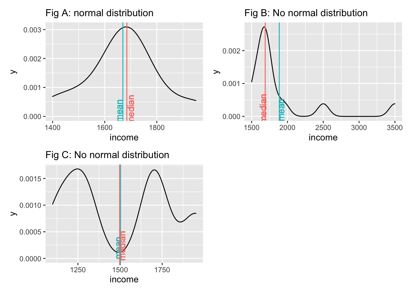 The first plot clearly shows that data is not normally distributed. If anything, it looks more like the back of a camel. The technical term for this distribution is called ‘bimodal distribution’. In cases where our data has even more peaks we consider it as a ‘multimodal distribution’. If we identify distributions that look remotely like this, we can assume that there must be another variable that helps explain why there are two peaks in our distribution. The plot below reveals that gender appears to play an important role. Drawing the distribution for each subset of our data reveals that income is now normally distributed for each group and has two different means. Thus, solely focusing on normal distributions for a single variable would not be meaningful if you do not consider the impact of other variables. If we think that gender plays an important role to understand income levels, we would have to expect that the distribution is not normal when looking at our data in its entirety.