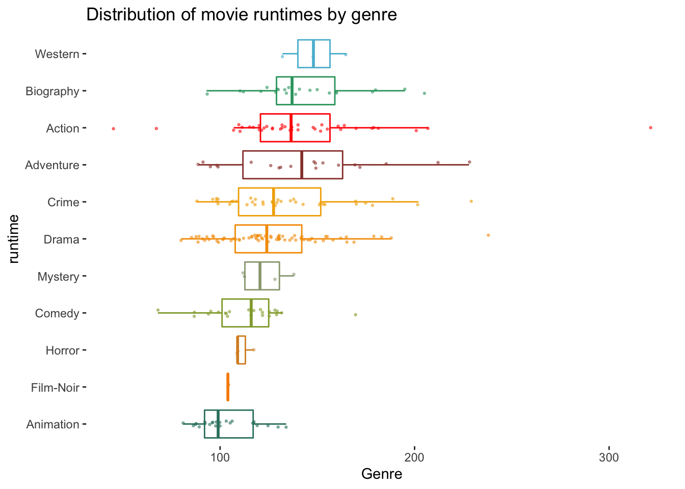 To round things off, let me share with you one more visualisation, which demonstrates that outliers might also have to be defined based on specific groupings of your data, e.g. movie genres. Thus, it might be essential to consider outliers in light of sub-samples of your data rather than the entire dataset, especially when comparing groups (see Chapter 12).