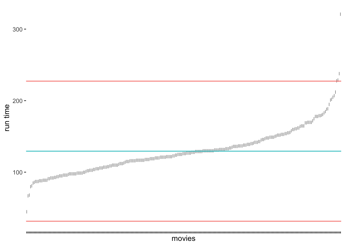 A very frequently used approach to detecting outliers is the use of the standard deviation. Usually, scholars use multiples of the standard deviation to determine thresholds. For example, a value that lies 3 standard deviations above or below the mean could be categorised as an outlier. Unfortunately, there is quite some variability regarding how many multiples of the standard deviation counts as an outlier. Some authors might use 3, and others might settle for 2 (see also Leys et al. (2013)). Let’s stick with the definition of 3 standard deviations to get us started. We can revisit our previous plot regarding runtime_min (see Figure 8.5) and add lines that show the thresholds above and below the mean. As before, I will create a base plot outlier_plot first so that we do not have to repeat the same code over and over again. We then use outlier_plot and add more layers as we see fit.