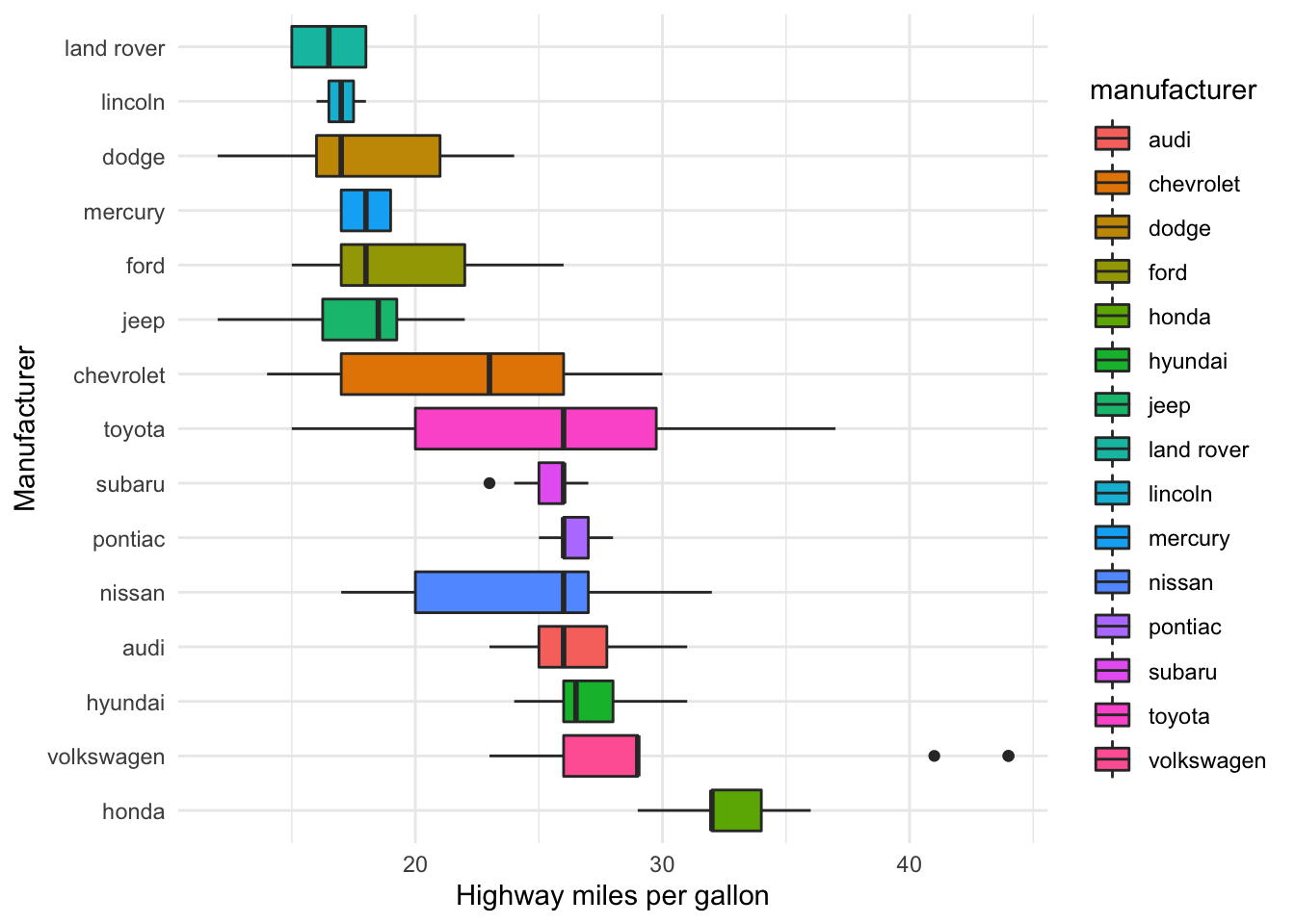 As you can see, cars from Honda appear to drive furthest with the same amount of fuel (a gallon) compared to other vehicles. Thus, if you are looking for very economical cars, you now know where to find them.
