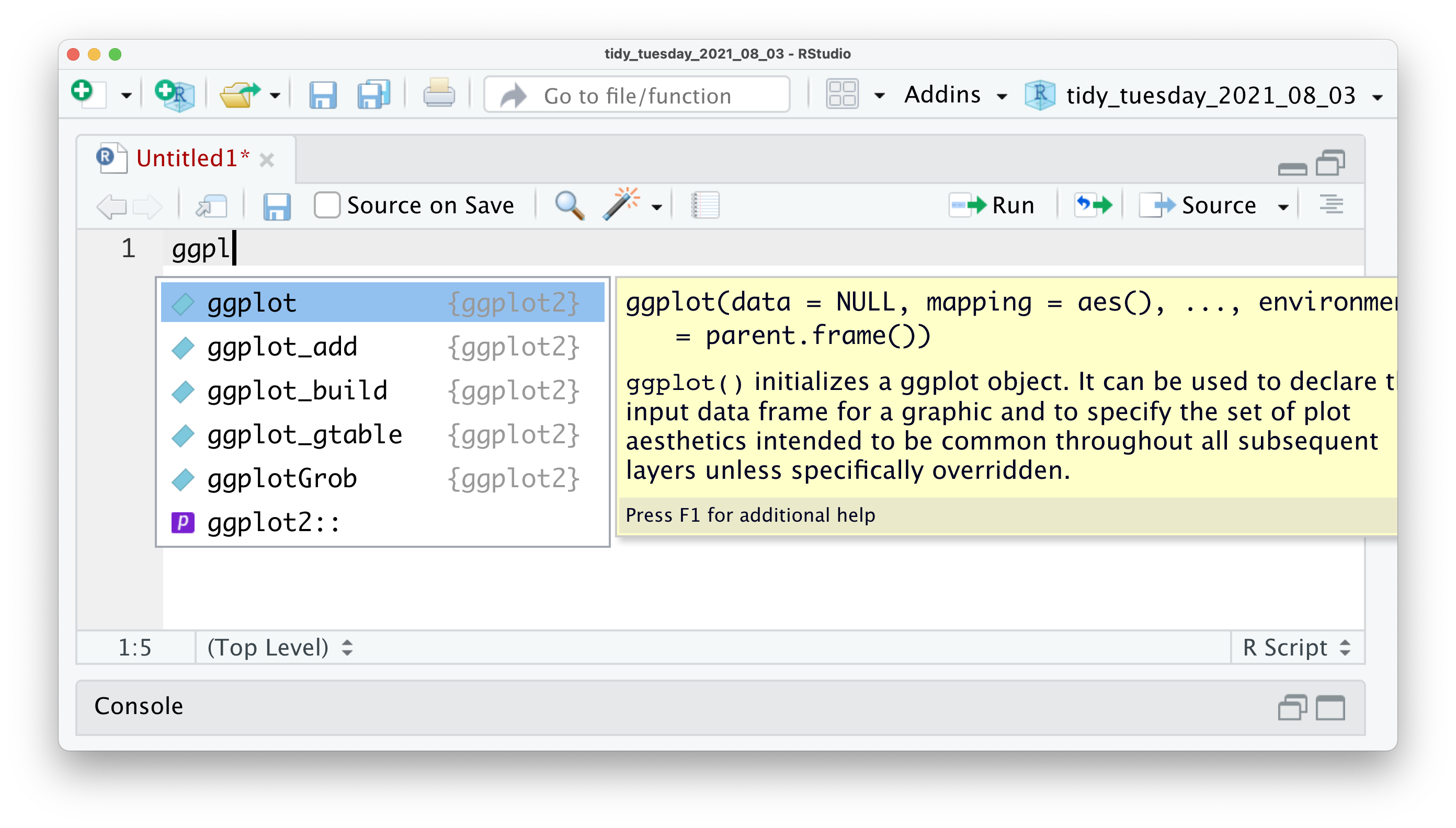 Lastly, the console and the R script editor both feature code completion. This means that when you start typing the name of a function, R will provide suggestions. These are extremely helpful and make programming a lot faster. Once you found the function you were looking for, you press Return ↵ to insert it. Here is an example of what happens when you have the package tidyverse loaded and type ggpl. Only functions that are loaded via packages or any object in your environment pane benefit from code completion.