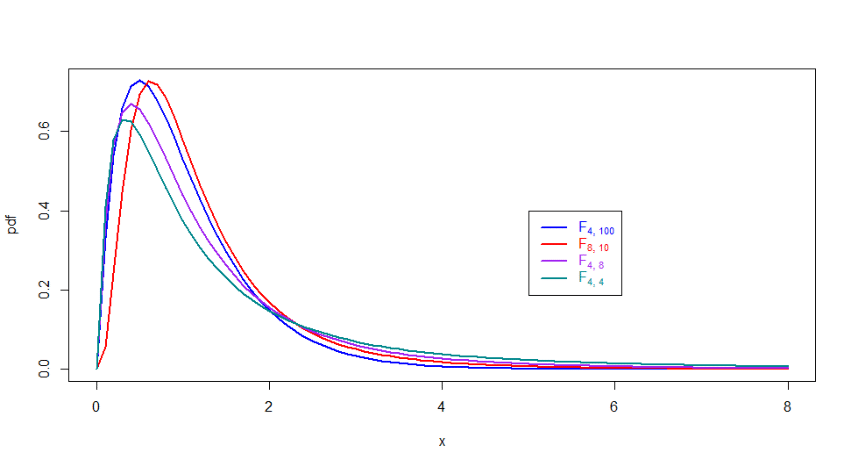 - Expected value and variance for \(F\sim F_{v_{1},v_{2}}\) (note that the order of the degrees of freedom is important!) is given by: \[\begin{eqnarray*} E\left[ F\right] &=&\frac{v_{2}}{v_{2}-2}\text{, for }v_{2}>2 \\ Var\left( F\right) &=&\frac{2v_{2}^{2}\left( v_{1}+v_{2}-2\right) }{% v_{1}\left( v_{2}-2\right) ^{2}\left( v_{2}-4\right) }\text{, for }v_{2}>4. \end{eqnarray*}\]