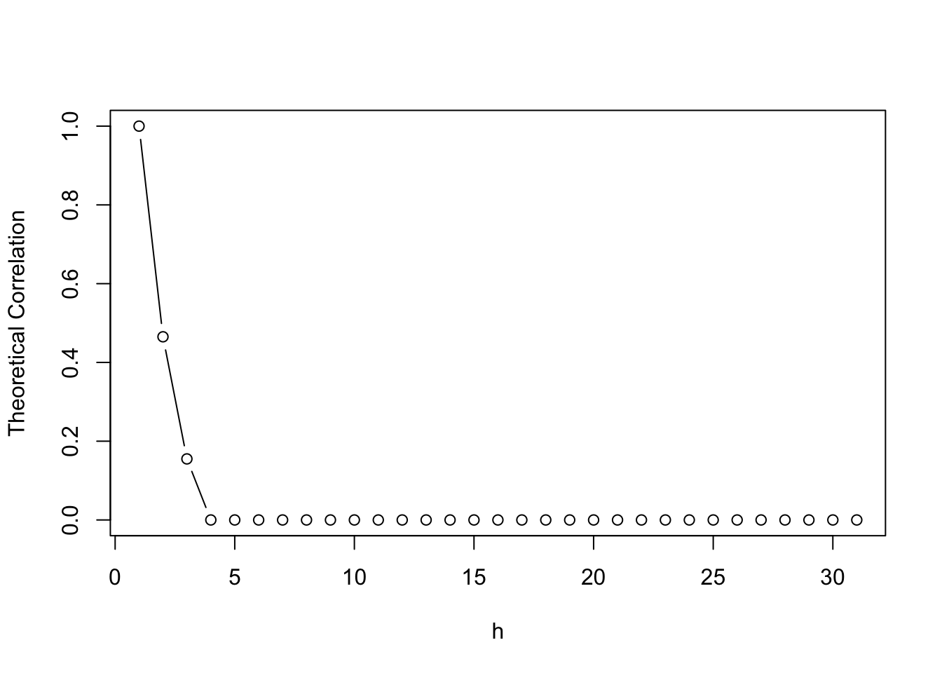 An \(MA(q)\) process will have a theoretical correlation that drops sharply to \(0\) for values of \(h\) larger than \(q\). This is consistant with the workings of Lemma 7.3.2.