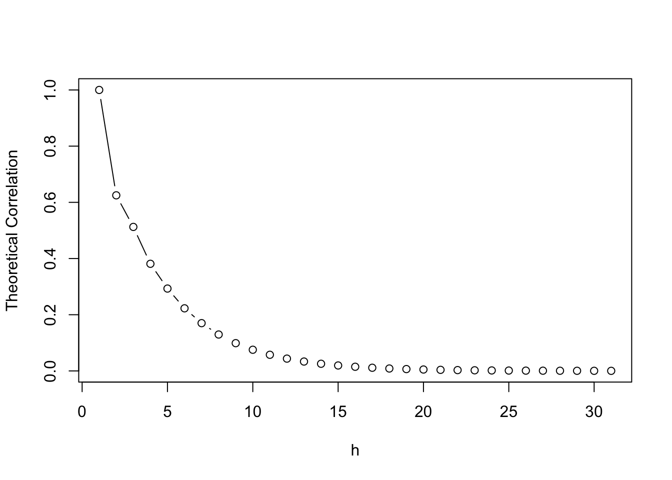 Typically a stationary \(AP(p)\) process will have a theoretical correlation that decays exponentially with \(h\). A quicker decay indicates smaller \(p\).