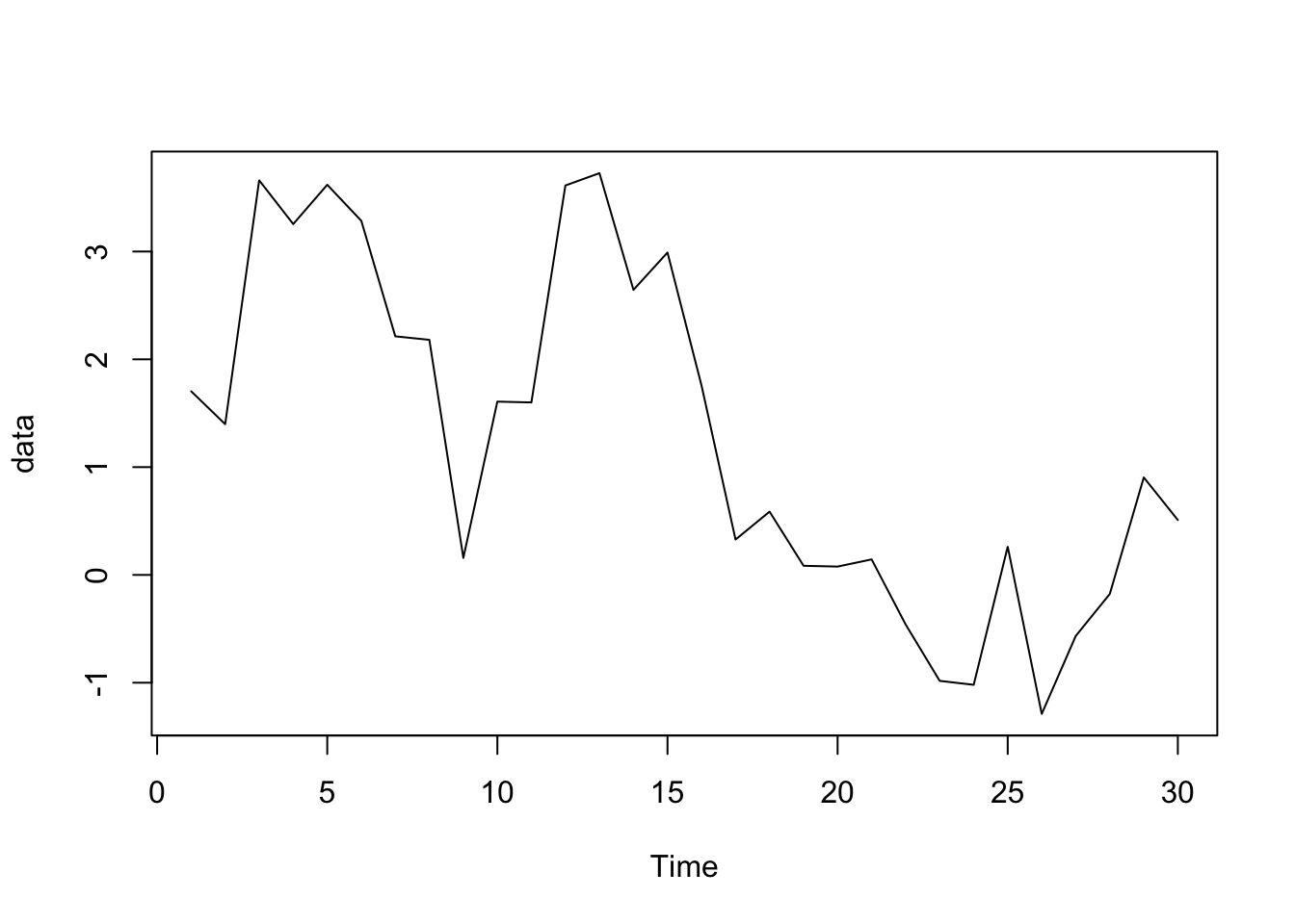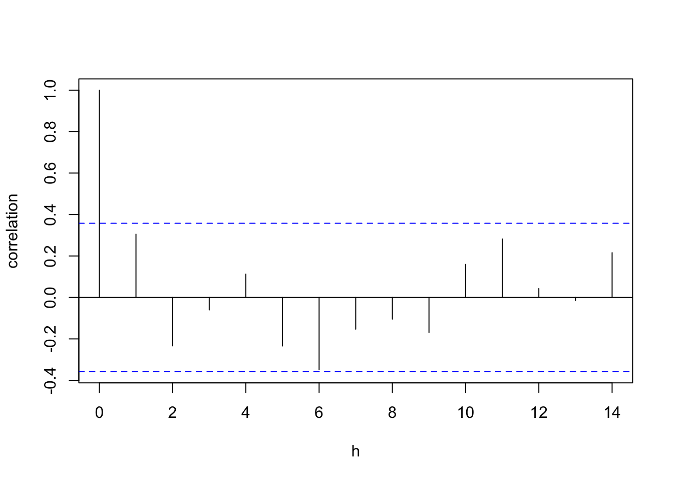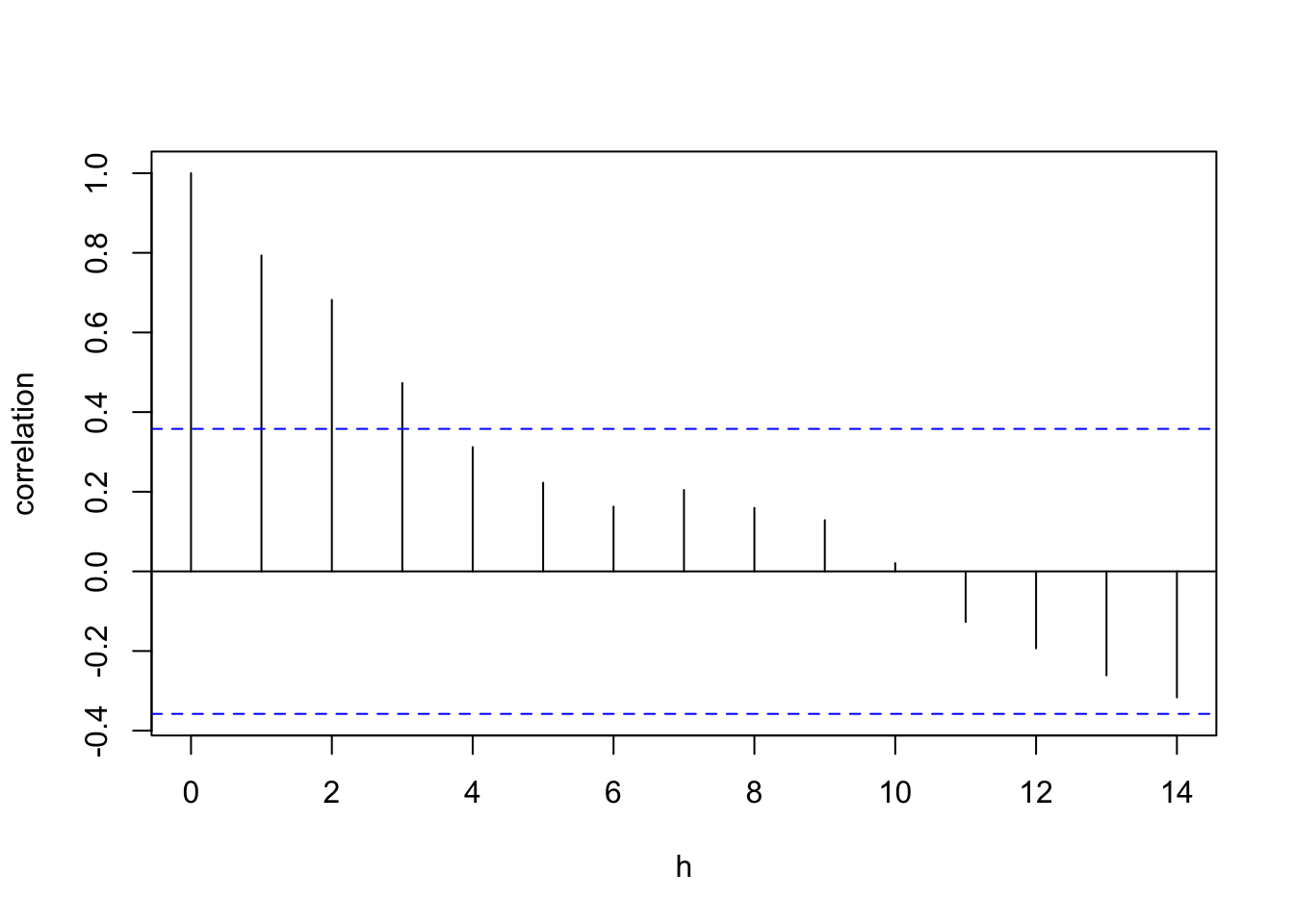 In particular, calculating the sample correlations is a key step in time series model selection. Typically one should calculate sample correlations \(r_1, r_2, \ldots, r_{30}\). These can then by plotted in a correlogram: a plot of \(r_h\) against \(h\).