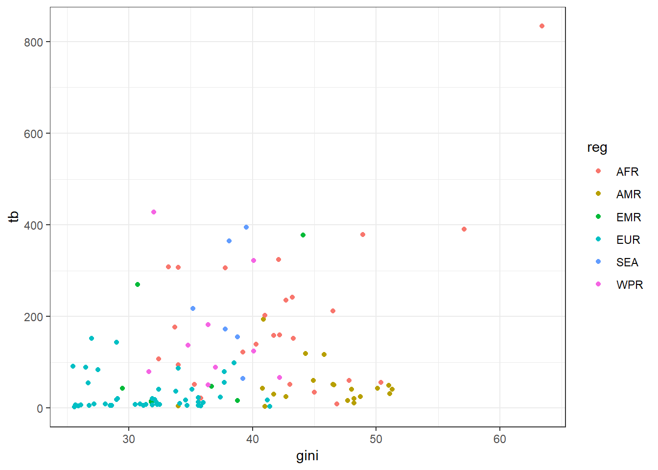 ggplot(data = sdg, aes(x = gini, y = tb, color = reg)) +