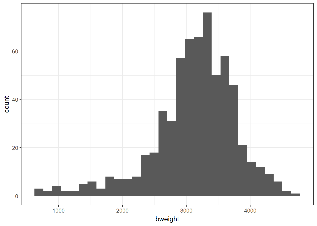 We can quickly graphically look at the distribution of a variable using the hist() command. Let’s take a look at the bweight variable. Because R is capable of storing more than one dataset in its working memory, we have to tell R both the dataset (bab9) and the variable (bweight) that we are interested in. We do this by using a dollar sign - the dollar sign says from the dataset on the left, extract the variable on the right.