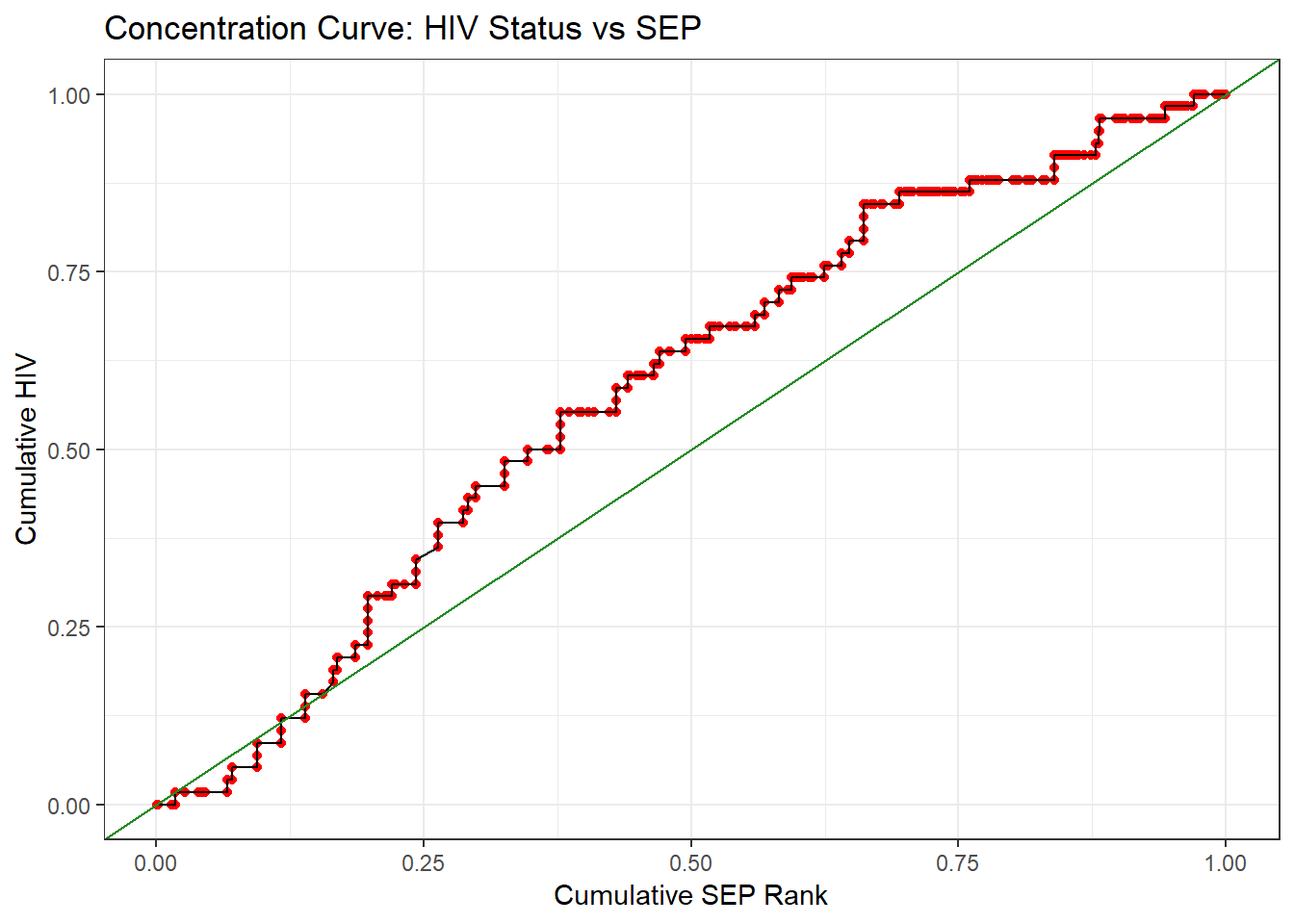 One more extensive analysis we can conduct to ascertain the association between SEP and HIV status is to construct a concentration curve. A concentration curve is designed to investigate inequality. A concentration curve ranks everyone from lowest SEP to highest SEP and compares the distribution of some health outcome against that ranking.