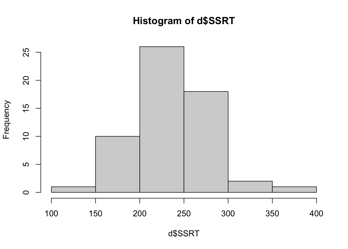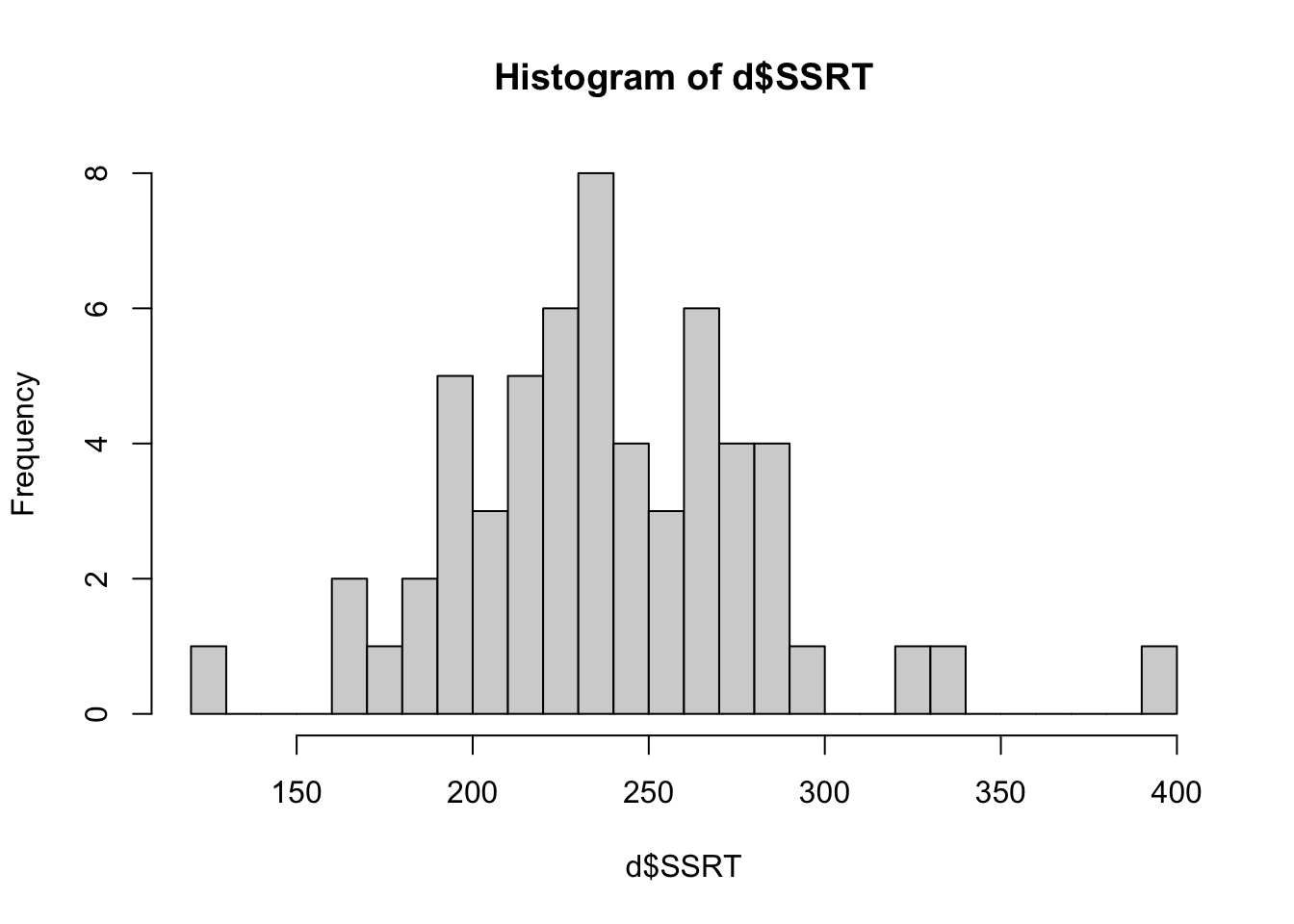 The bars show the number of cases in each of the bins shown on the horizontal axis. From this we can see that most of the SSRT values are around 200 to 300 msec, with a smaller number of more extreme values in either direction. Importantly, the distribution is roughly symmetrical: there are about as many values 100 msec above the mean as there are 100 msec below the mean. This is good to know as if the shape were very different (for example most people had values below 100 msec and a few had values about 1000 msec), this could affect how we will analyse the data.