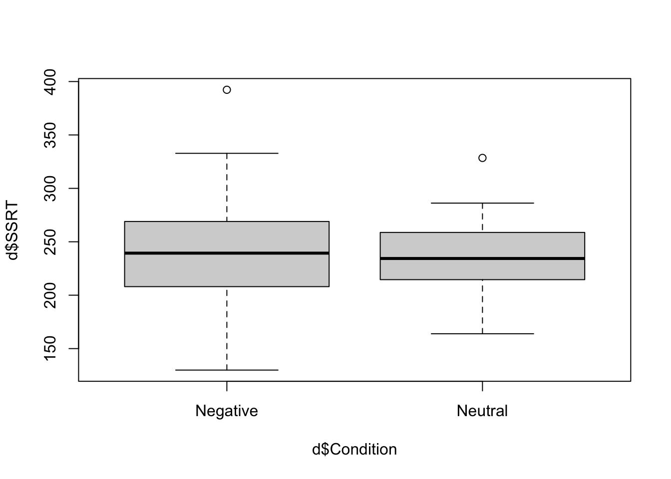 In your boxplot, the thick horizontal lines represent the median SSRTs in the two conditions. You can just about see (as we already know from table) that the median is very slightly higher in the Negative than the Neutral condition. The filled boxes are the areas containing half of the data points in each condition (i.e. the region from the datapoint at the 25th percentile to the one at the 75 percentile). The whiskers that point out from the boxes aim to capture the variability of the remaining data in both directions. The rule establishing the length of the whiskers is a bit complex, but basically they go to the largest (smallest) data point that is within 1.5 times the height of the box in either direction. Any remaining values outside the whiskers are shown as isolated points or outliers (there is one positive outlier in both conditions here).
