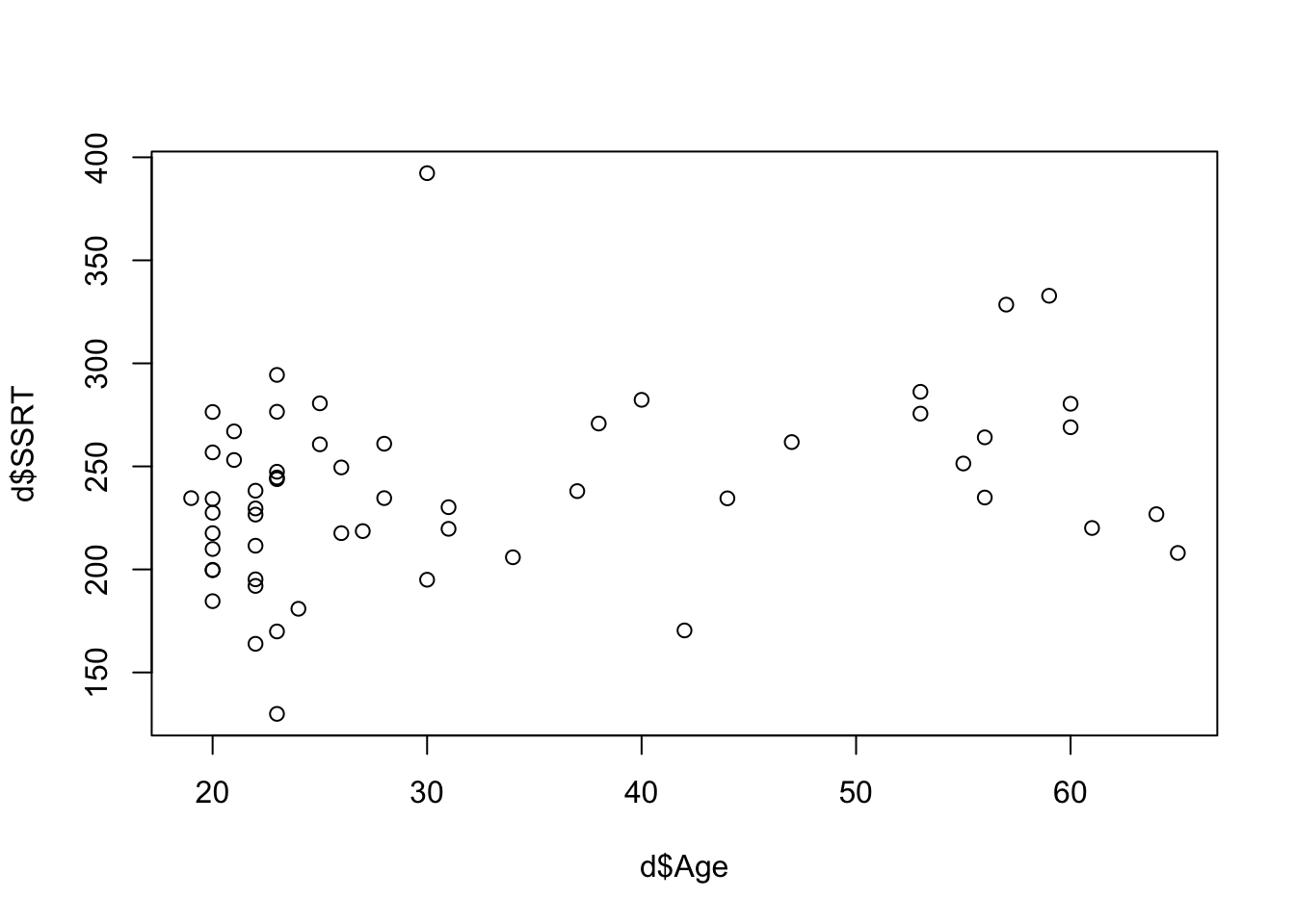 The final kind of quick plot we might want to make is the scatterplot, which we make with the function plot(). A scatterplot is useful when you want to quickly understand if there is any obvious relationship between two quantitative variables. We know that behavioural inhibition, at least as measured by the SSRT, tends to get a bit worse as you get older. Make a quick scatterplot of SSRT against Age (note the ~ meaning ‘by’ again):