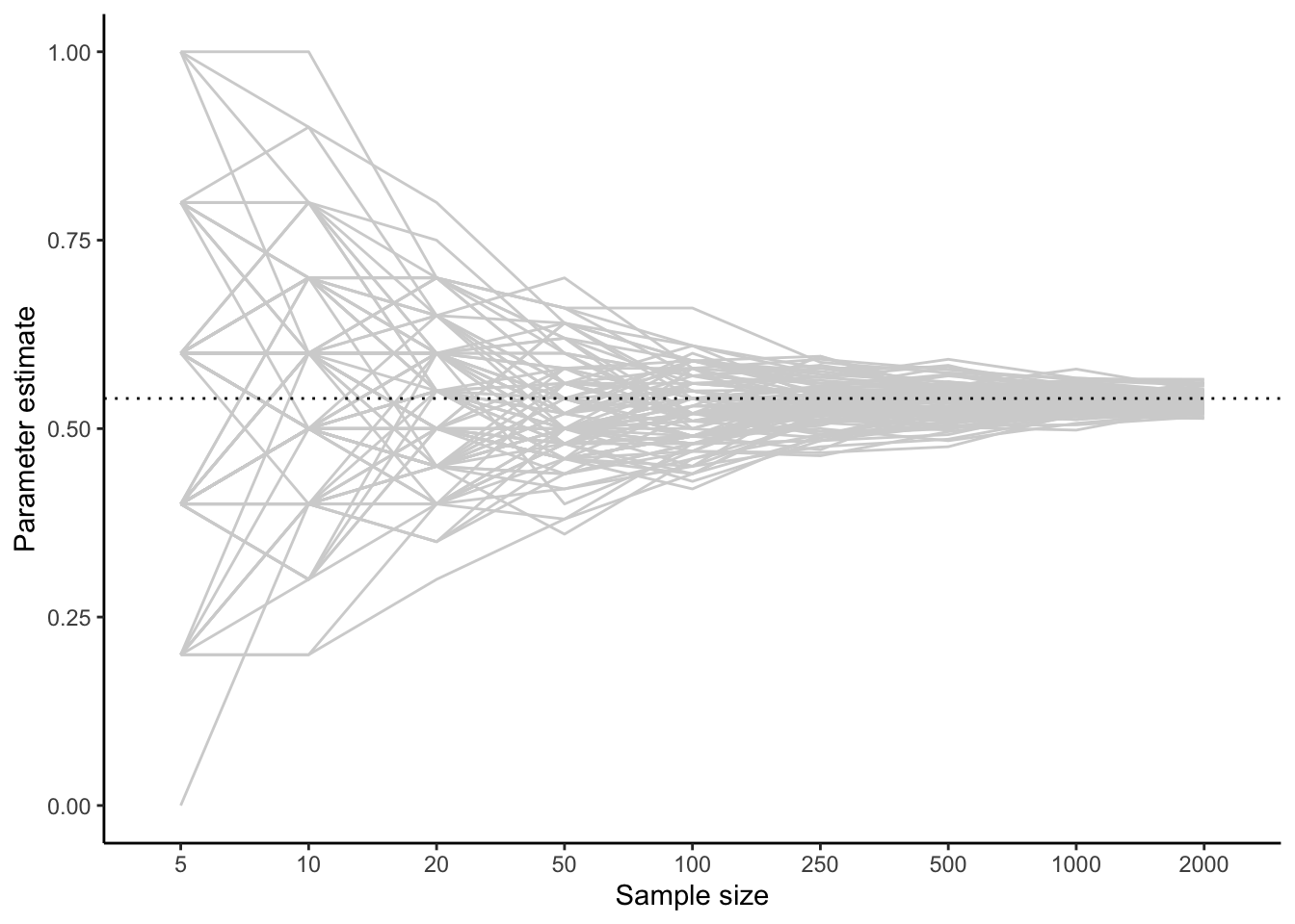But, my parameter estimate is imprecise. I could be a bit wrong. I could have got lucky or unlucky in who happened to fall into my sample. The magnitude of this imprecision is going to depend on my sample size (the number of people I interview). To see how this might go, the figure below simulates 100 data samples drawn from a population where \(\theta\) really is 0.54. For a series of sample sizes between 5 and 2000, I plot what my parameter estimate would be if I stopped sampling at that sample size.