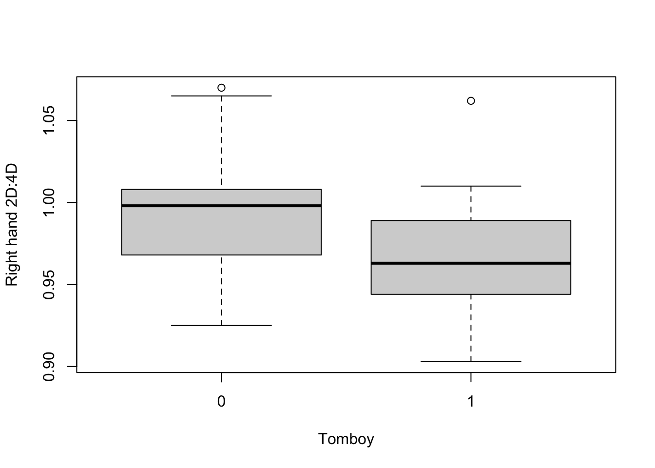 It looks like we have 20 women who were identified as tomboys, and 26 who were not. If the hypothesis of the study is supported, the tomboys will have lower values of rightHand than the non-tomboys. Let’s have a quick look: