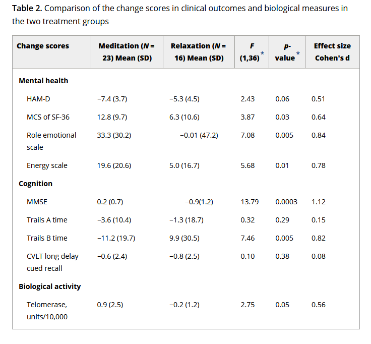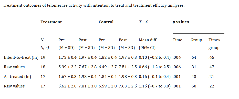 Here, all three studies include a control group who did not do mindfulness meditation and a treatment group who did. They all measured telomerase activity before and after the treatment in both groups. Then they do various statistical tests, not necessarily the same ones. However, all report, in their tables, some descriptive statistics of telomerase activity values in each group after the treatment, and we can make use of these. Let’s have a look at the relevant parts of the papers. Here are the relevant tables from the first two:
