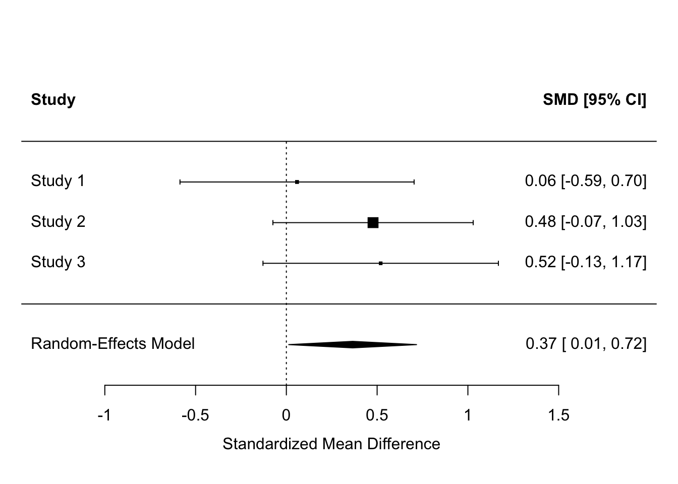 I would report the results in something like the following way. ‘We combined the standardised mean difference estimates from the three studies and performed a random effects meta-analysis. The estimated overall effect size was 0.37 (95% confidence interval 0.01 to 0.72), suggesting evidence that meditation increases telomerase activity relative to control. There was no evidence for heterogeneity across studies (\(Q^2(2)\) = 1.24, p = 0.54; \(I^2\) = 0%). I would then show the forest plot. By the way, the default model fitted by metafor is a called a random-effects model. It assumes that the underlying effect sizes are drawn from a distribution whose mean we are trying to infer. There are alternatives (’fixed-effect models’), but I won’t go into them here as random-effects is more generally appropriate, and is more conservative.