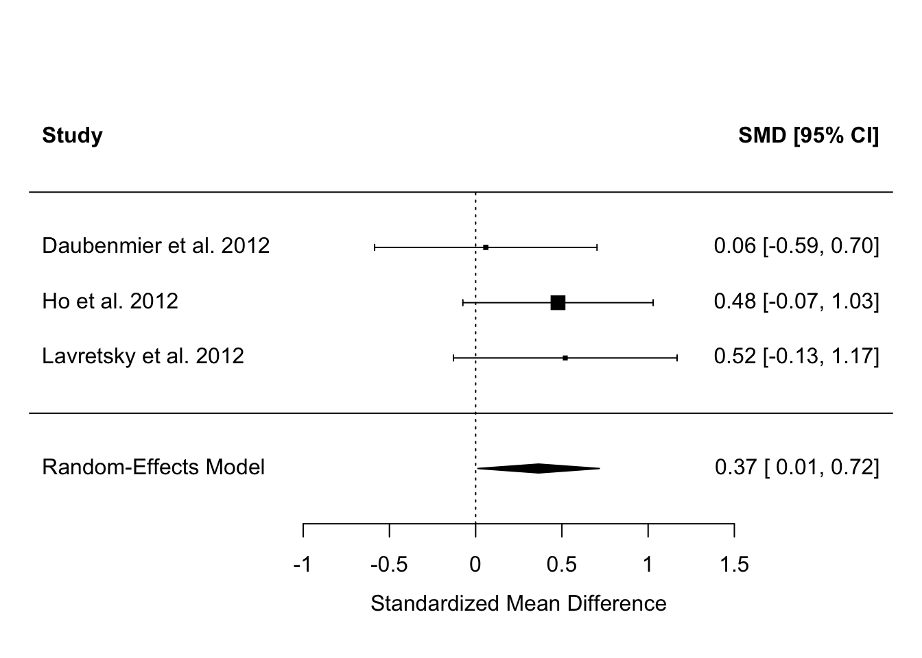 Something you might have noticed is that the claims about significance for the individual studies implied in the forest plot seem to be at odds with what the papers said. For example, Daubenmeir et al. reported no significant effect (and we concur), but both Ho et al. and Lavretsky et al. claimed their effects as significant, whereas we show their 95% confidence intervals as crossing zero. In both cases, this is because they performed more sophisticated analyses than our simple SMD, with more covariates, that make their precisions better. But, we had to use SMD since although it is basic we could get some version of it for every study. The point of meta-analysis is that the significance of individual studies is not terribly important; it’s the overall estimate that you are interested in, and in this, the overall evidence suggests that the claims Ho et al. and Lavretsky et al. made from their individual studies were probably generalizable.