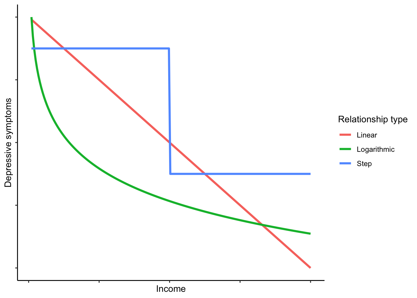 Logarithmic negative association. Depressive symptoms reduce by a constant amount for each unit increase in the logarithm of income. This would imply a benefit of earning more that flattens off, so the first 500 euros you earn would reduce your symptoms a lot, the second 500 a bit less, the next 500 less still, and so on.