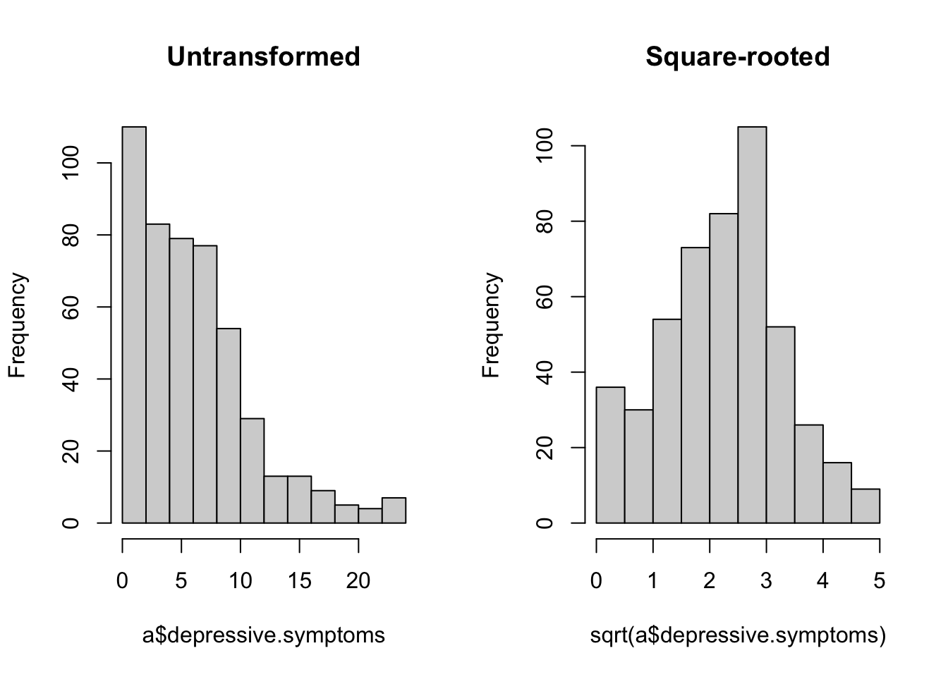 If you run table(a$threshold.met), you should see that 220 of the participants were below the threshold and 263 above. And as for the outcome, we are going to square-root transform the depressive.symptoms variable. If you look at the distribution, you will see why; many people have scores close to zero, and a few have very high scores, making for a right-skewed distribution. The square-root transformation reduces this skew considerably. (The par(mfrow) = c(1, 2) below outputs the two histograms next to one another; the par(mfrow)=c(1, 1) afterwards is to reset the settings to have figures appear one at a time in future.)