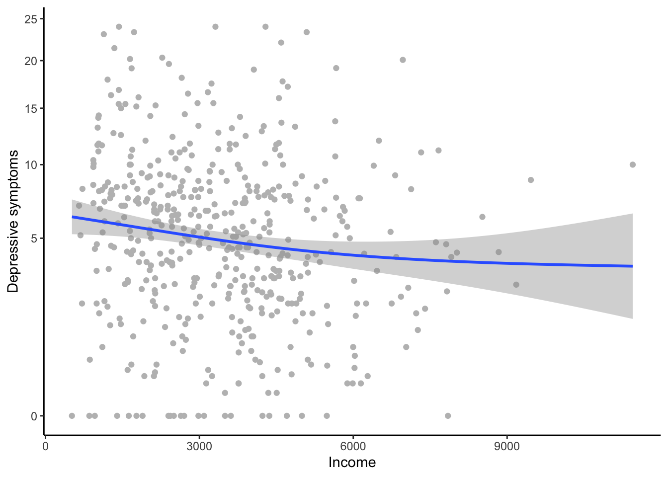 Linear negative association. Depressive symptoms reduce by a constant amount for each euro increase in income.