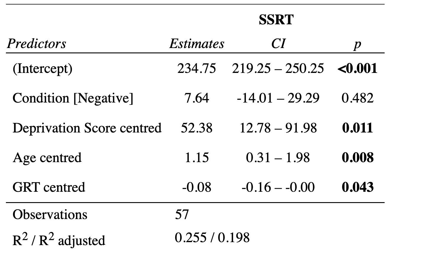 significant null hypothesis significance tests for Deprivation_score, Age and GRT, but not for condition. That’s why there are stars next to the column for those variables (two stars for Age because the p-value is not just less than 0.05, but also less than 0.01 in this case). When the p-value is less than 0.05, we speak of ‘rejecting’ the null hypothesis, and of the result being ‘significant’. On these criteria, we would reject the null hypotheses that Deprivation_score, Age and GRT are unrelated to SSRT (there are significant associations between these variables and the outcome), but accept the null hypothesis that Condition has no effect on SSRT (there is no significant effect).