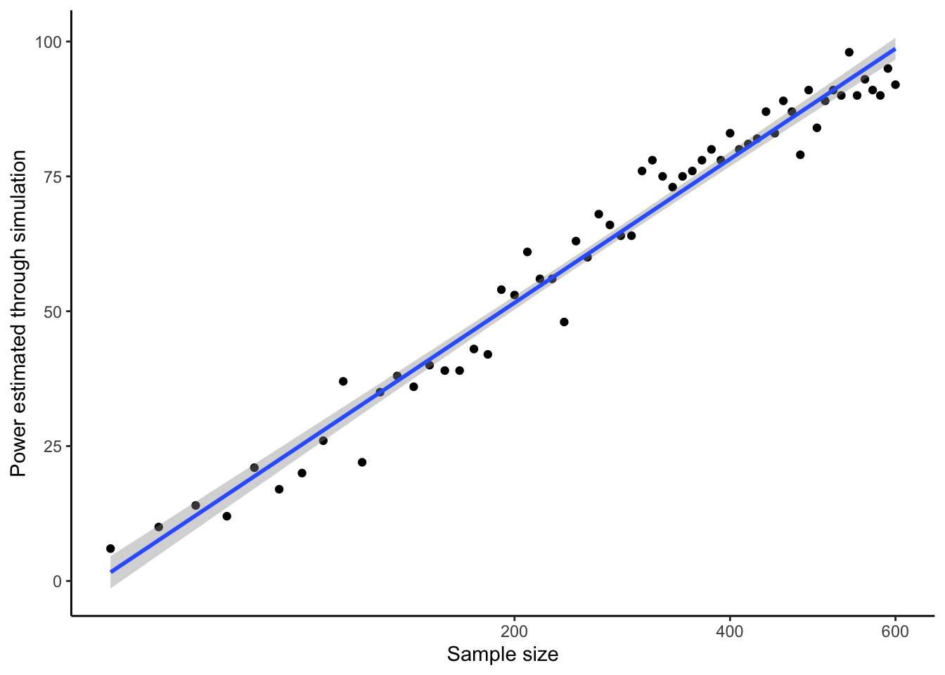 On this graph, there is some noise in the power-sample size relationship. This is due to the fact that we only ran 100 simulations at each sample size. If you wanted to smooth this, you could run 1000 simulations at each sample size. This would give you much more precise estimates and a smoother curve, but it would take ten times as long to run.