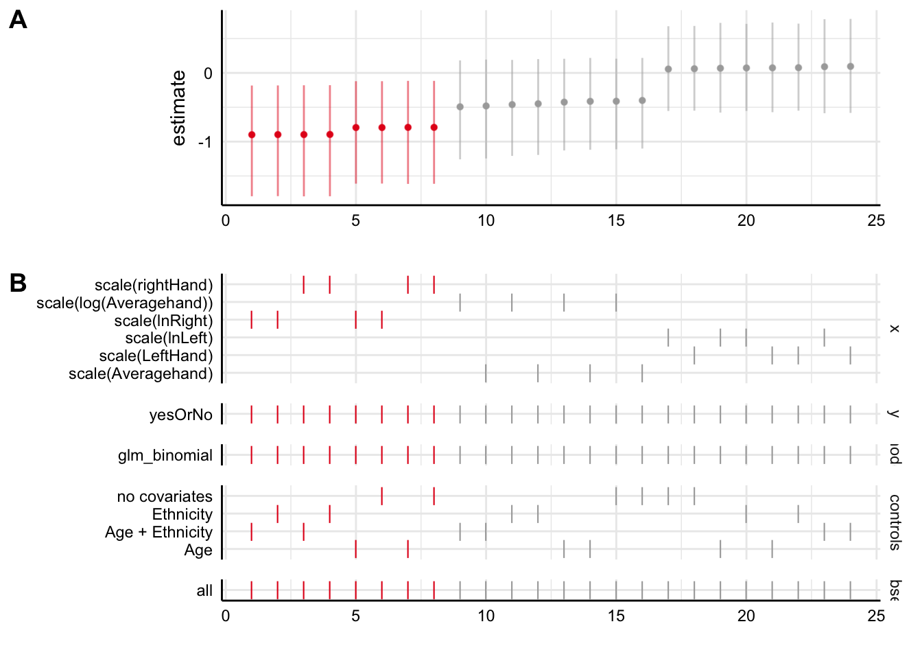 Plot B shows you what is in each of the specifications in the plot above, showing a tick where a variable is present. So as you can see, the first eight are the specifications that use the right hand 2D:4D rightHand. All of these find the significant associations. In fact, within these eight, it makes remarkably little difference whether we log transform or not, and which covariates we include.