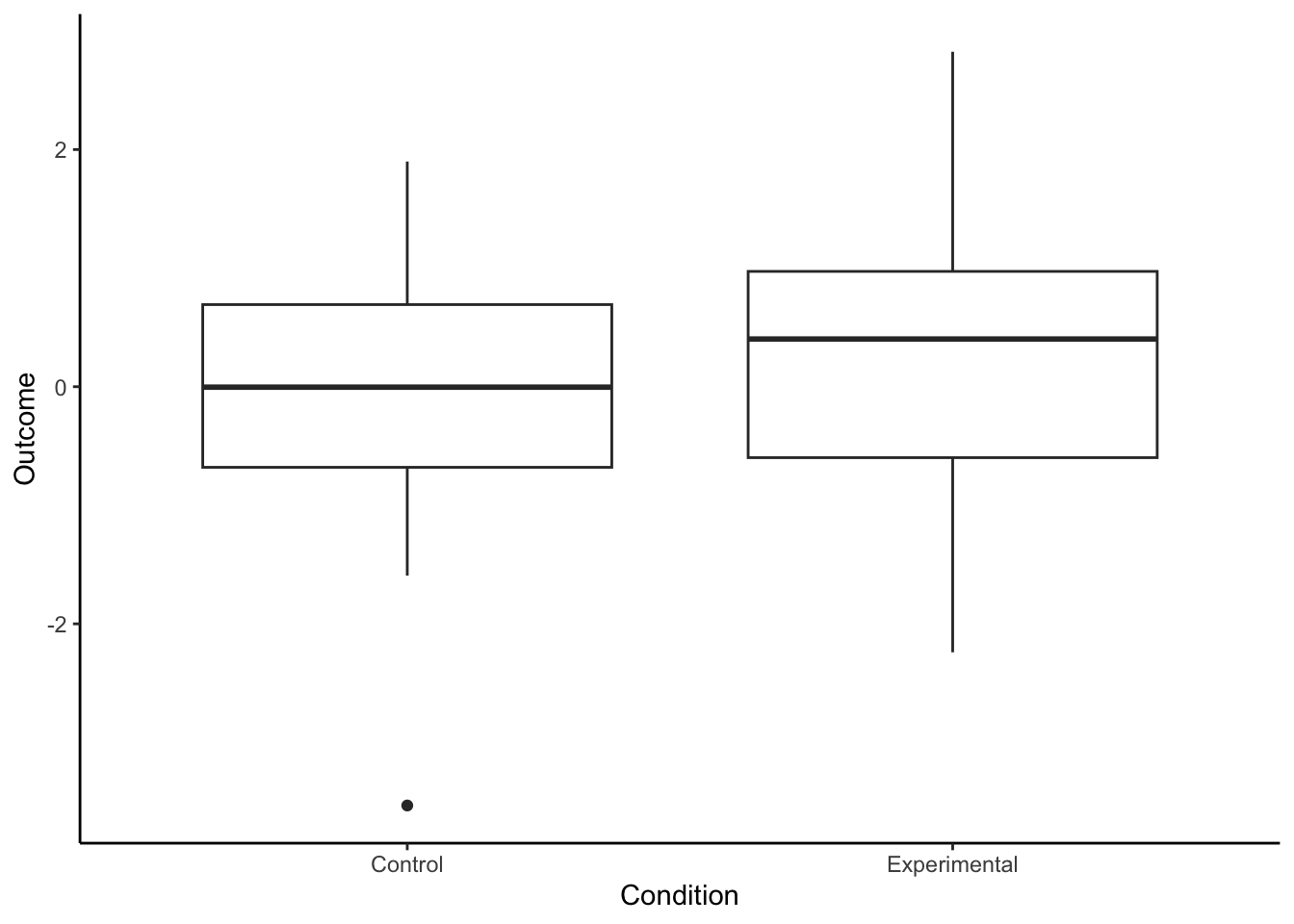 simulated.data <- data.frame(Condition, Outcome)We have our first simulated data set, simulated.data. We can do things like make plots of what we might see. Note that this plot will look different every time you run the code (and yours will look different from mine), because we are sampling different data points from the underlying distribution each time.