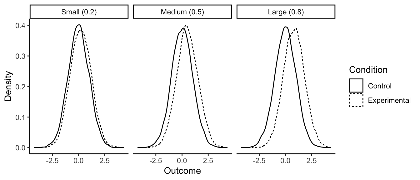 With a small effect (0.2), the means are slightly different, but frankly you need a microscope to see it. The distributions are still almost completely overlapping. Many values from the control condition are higher than many values from the experimental condition, and you certainly can say nothing about which condition a data point came from by looking at the outcome value. With a large effect (0.8), the difference in means is much more obvious. If you guessed which condition a given data point came from based on its value, you would be right much more often than not. But still, even with an effect size of 0.8 standard deviations, the distributions are very overlapping. Your manipulation is certainly not a magic bullet, dwarfing other influences on the outcome.