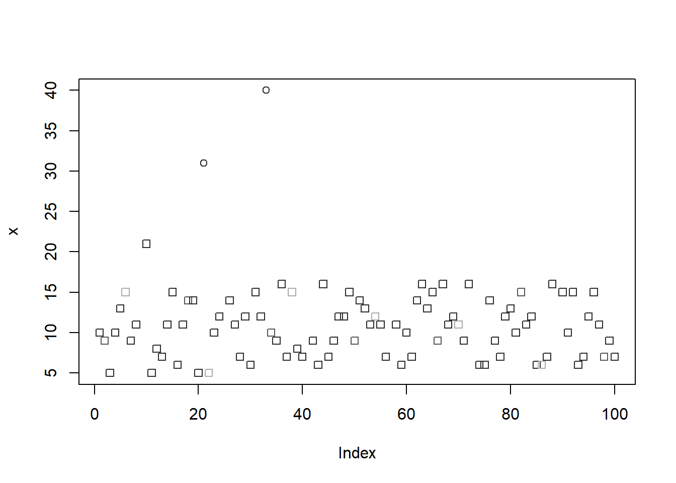 y<-c(24, 14, 17, 25, 12, NA, 11, NA)En el caso de bases datos, que son más frecuente que los vectores, podemos también identificar datos missing. Las siguientes líneas de códigos insertan una base de datos llamada data2, con los vectores creados anteriormente.