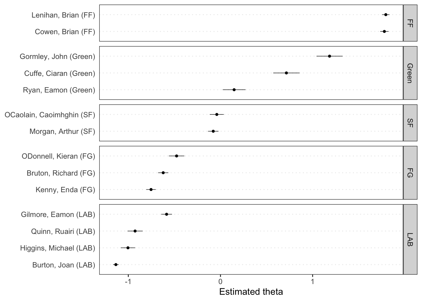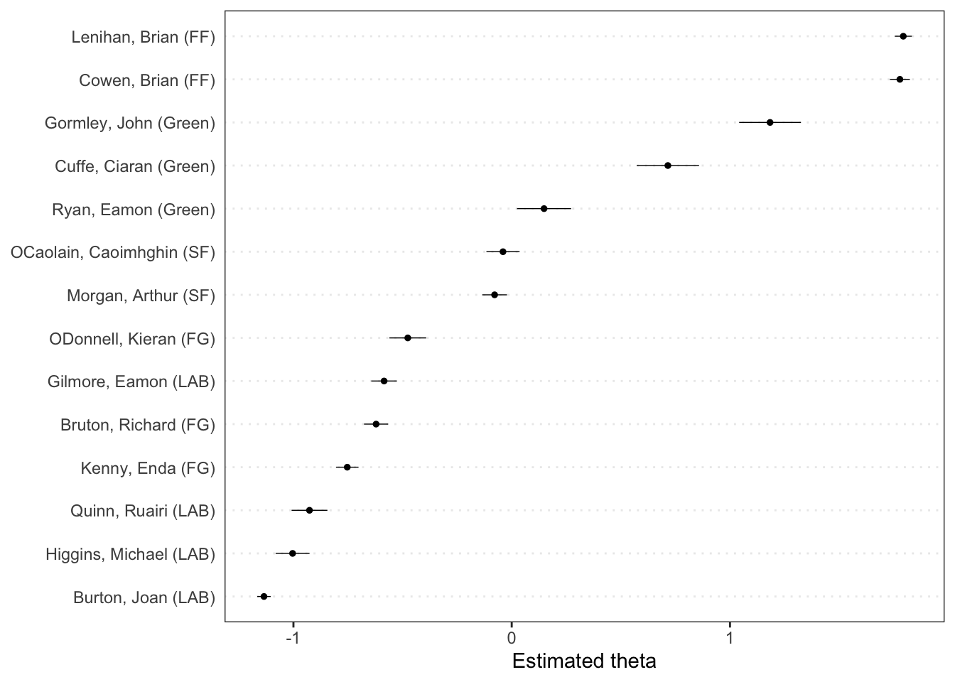 Visualizando o resultado através da função textplot_scale1d() presente no pacote quanteda.textplots temos a posição estimada dos discursos dos parlamentares no caso da discussão sobre o orçamento irlandes sem a necessidade de um score pré definido.